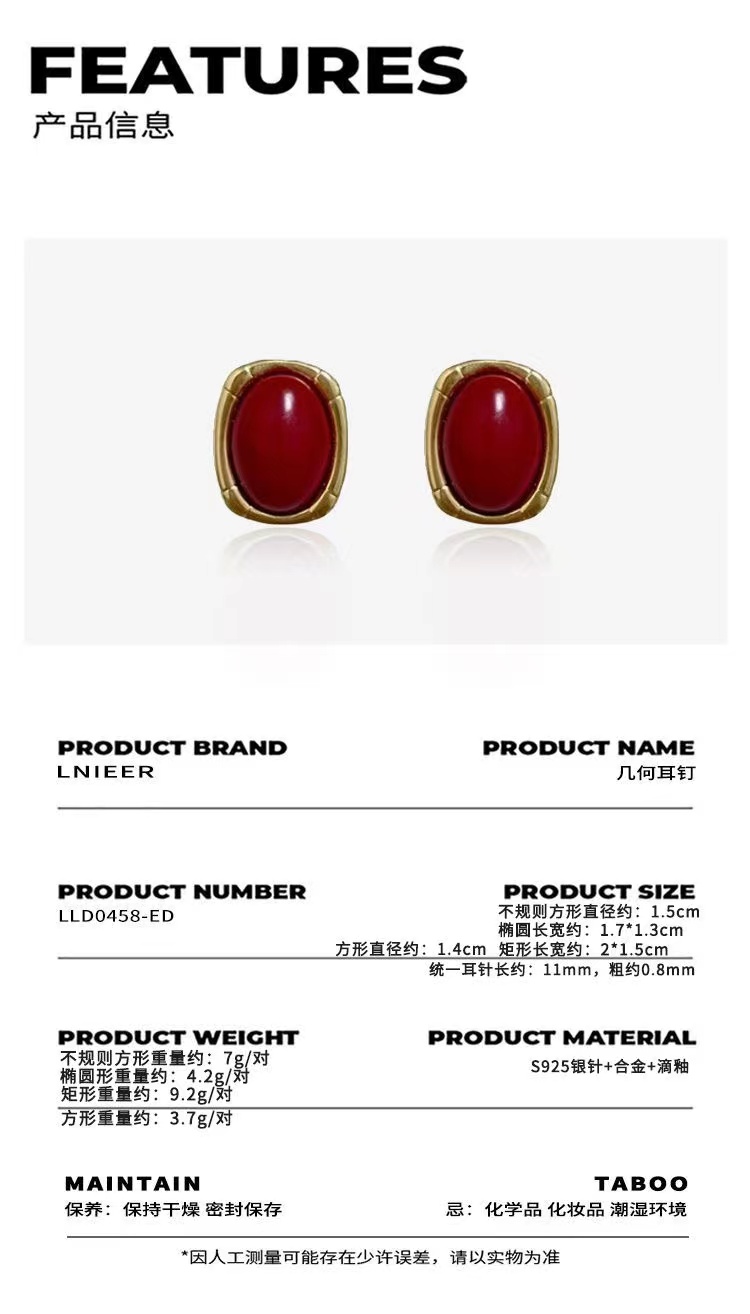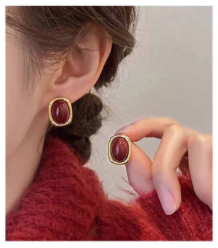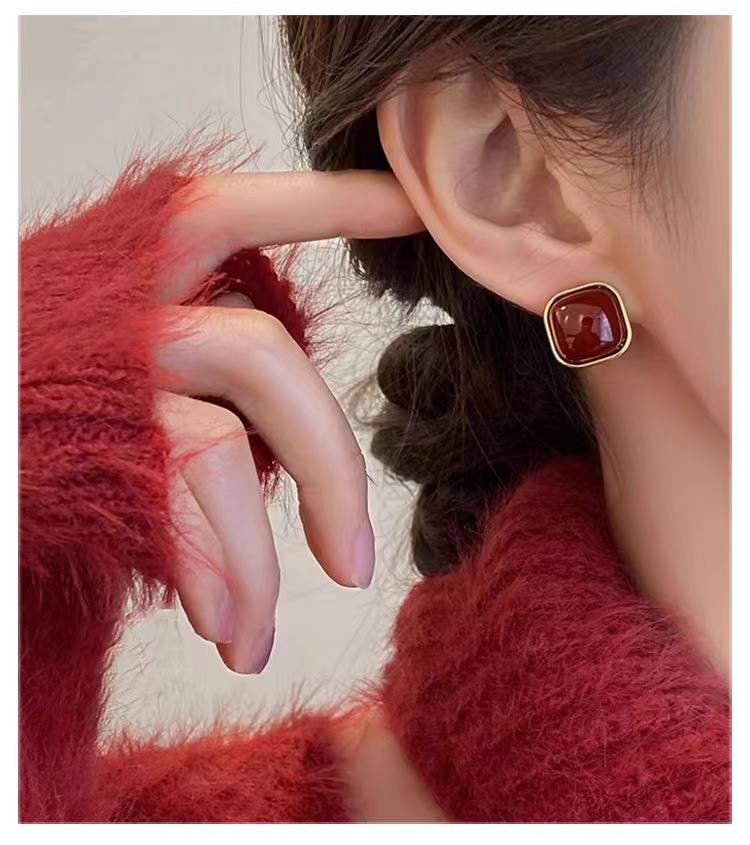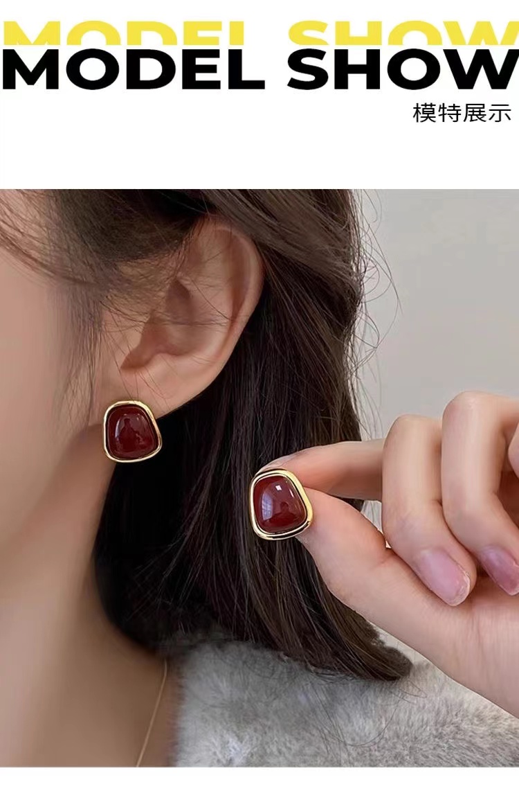 復古港風紅色滴釉幾何耳釘女秋冬氣質耳飾情人節禮物送女友