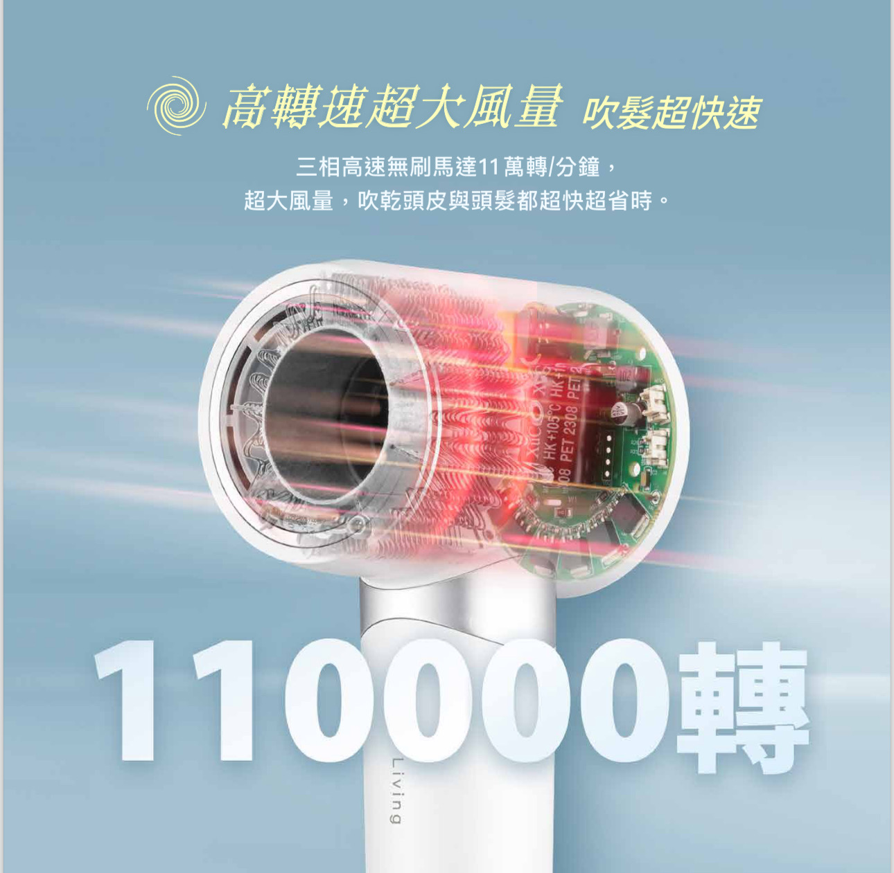 三相高速無刷馬達11萬轉/分鐘,超大風量,吹乾頭皮與頭髮都超快超省時。