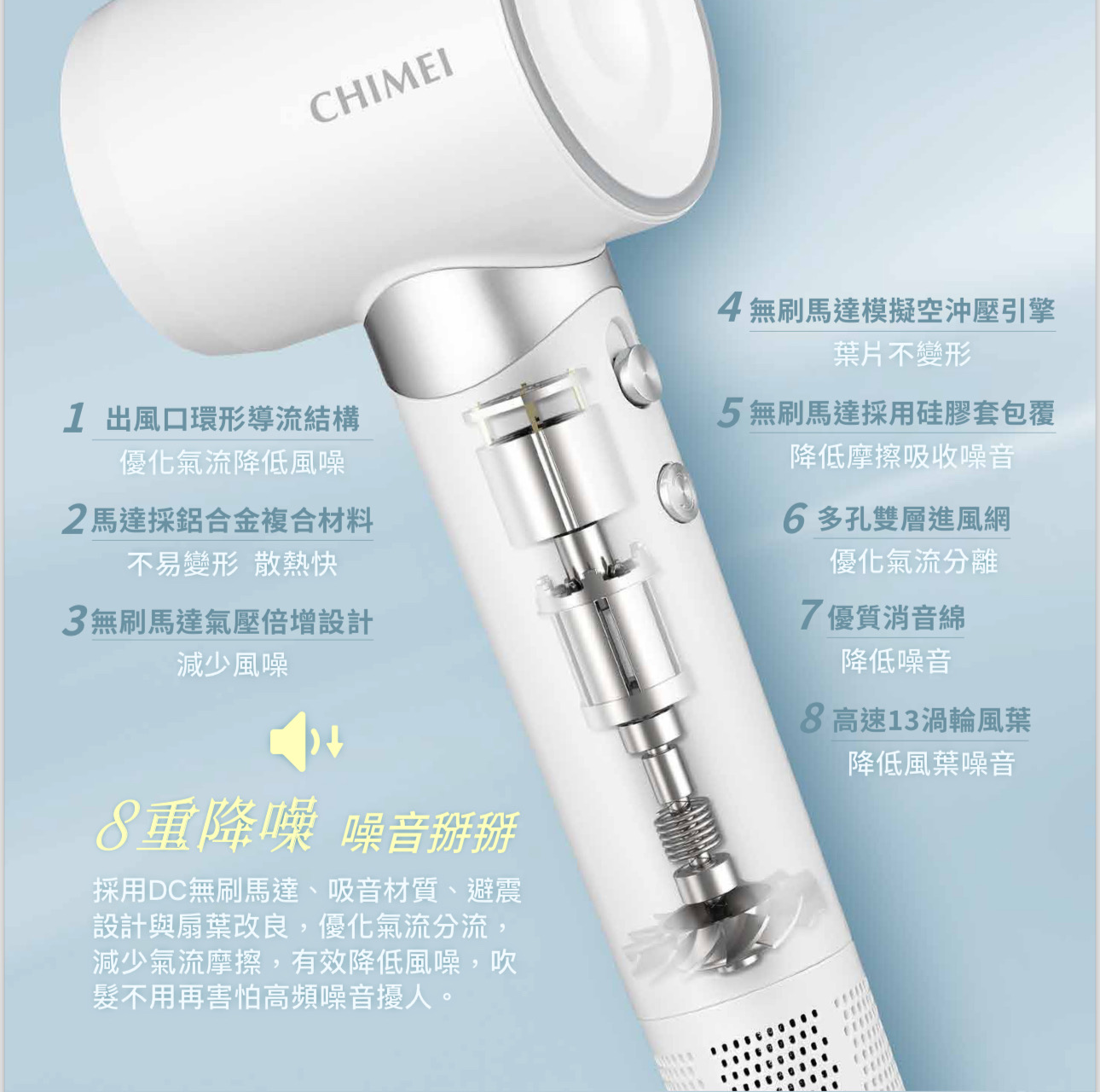 採用DC無刷馬達、吸音材質、避震設計與扇葉改良,優化氣流分流,減少氣流摩擦,有效降低風噪,吹髮不用再害怕高頻噪音擾人。