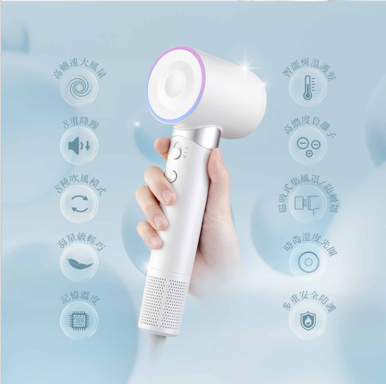 吹髮過程中會釋放超高濃度2億負離子,幫助頭髮毛鱗片閉合,減少靜電與毛躁,撫平毛躁,有效保濕,長期使用秀髮將會更加柔順光滑。