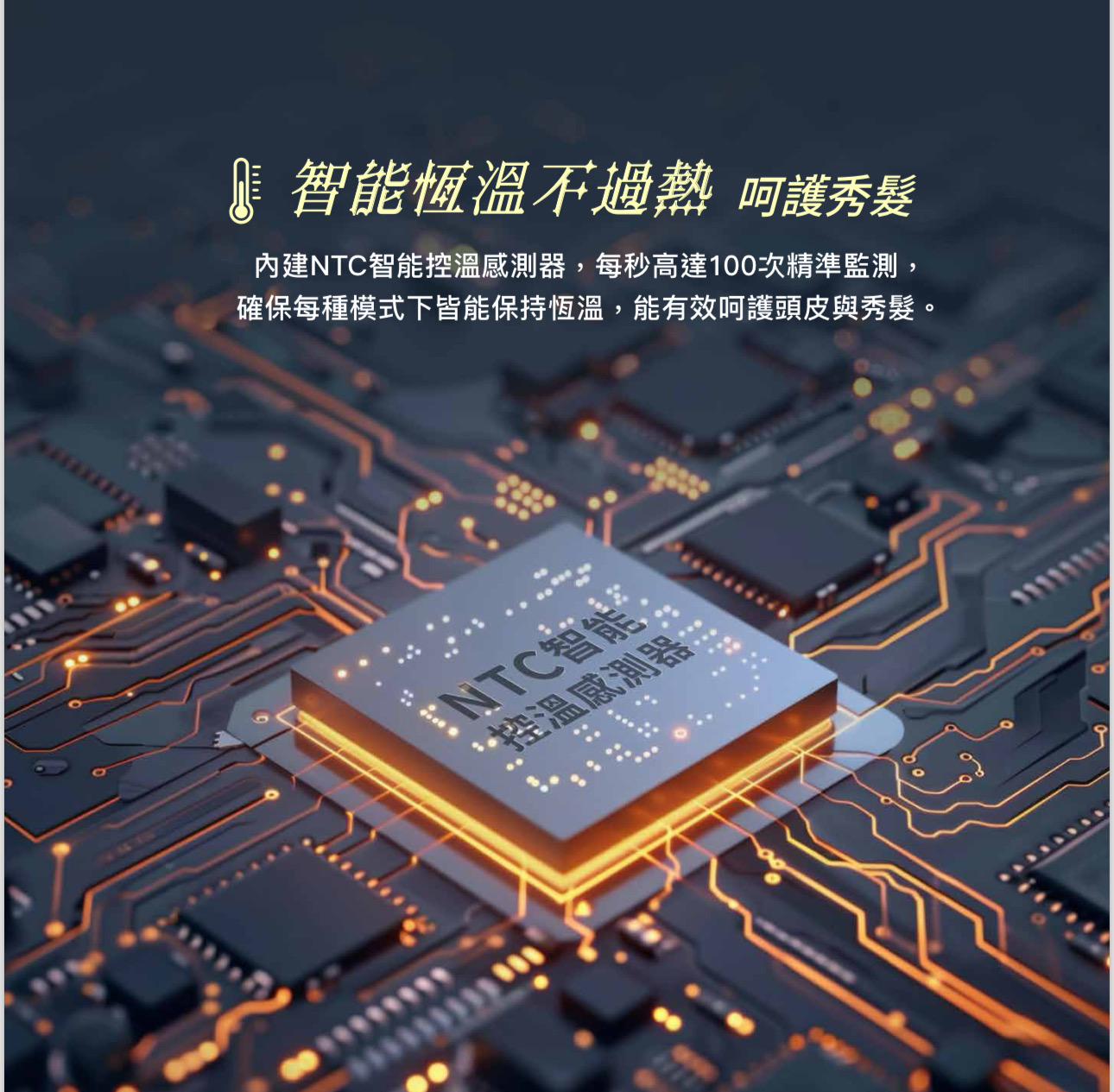 內建NTC智能控溫感測器,每秒高達100次精準監測,確保每種模式下皆能保持恆溫,能有效呵護頭皮與秀髮。