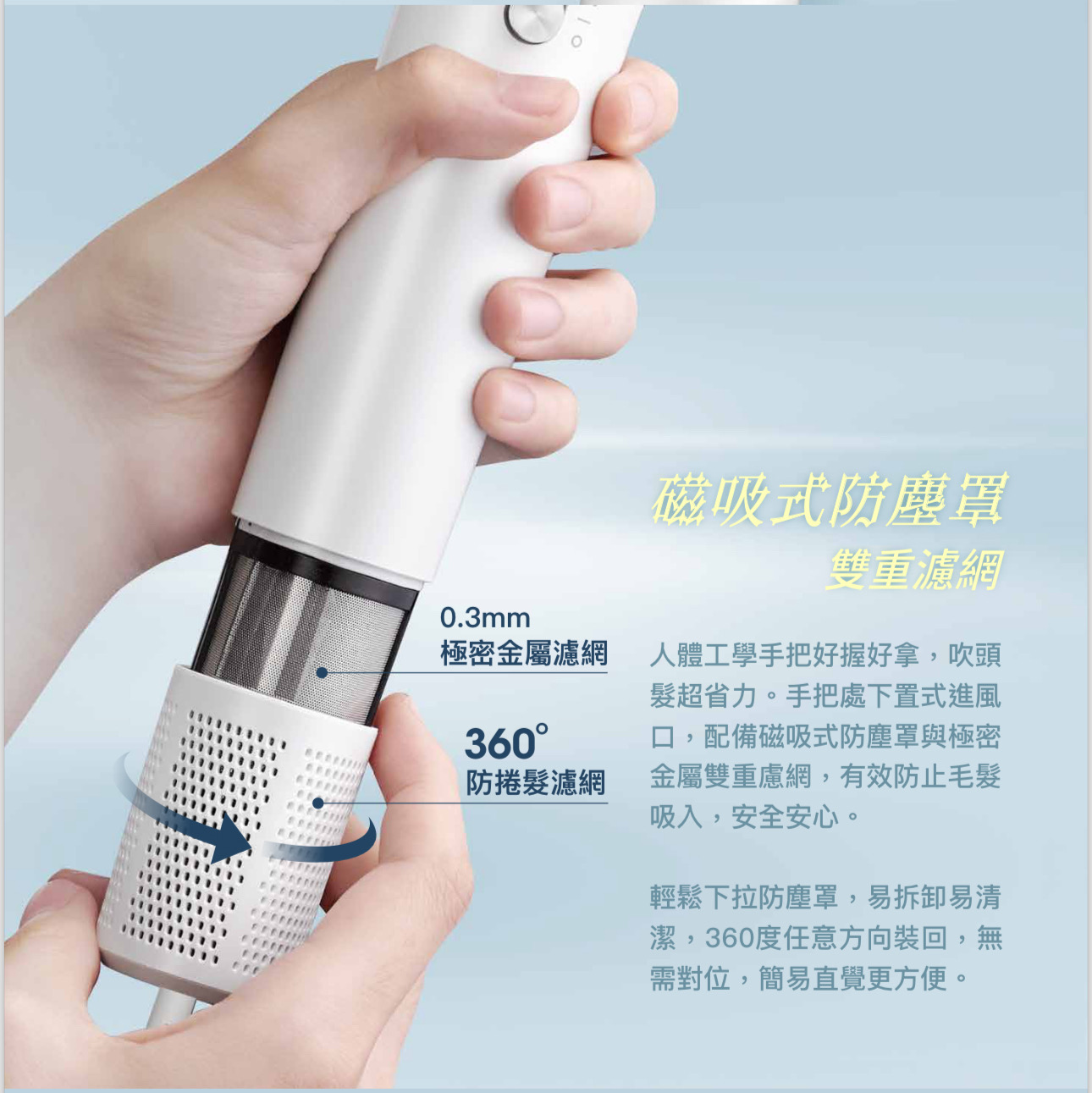 人體工學手把好握好拿,吹頭髮超省力。手把處下置式進風口,配備磁吸式防塵罩與極密金屬雙重慮網,有效防止毛髮吸入,安全安心。