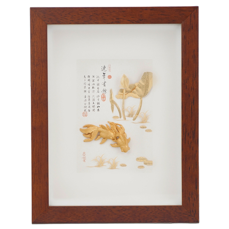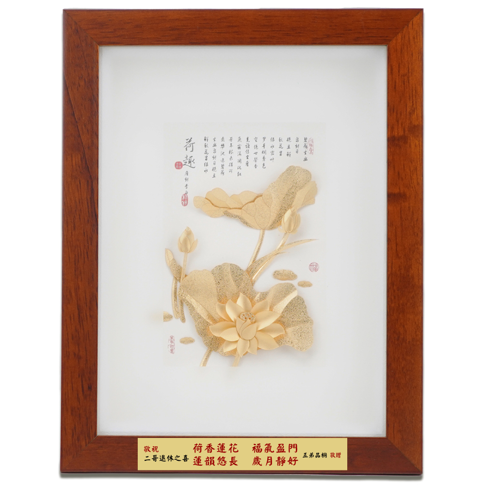 這幅「荷香蓮花」金箔畫,融合精緻立體金箔工藝與書法詩詞背景,呈現出蓮花出淤泥而不染、濯清漣而不妖的高尚品格。蓮花花瓣層層堆疊,葉片細緻流暢,金色光澤與木質畫框相映成趣,散發溫潤典雅的藝術氣息。書法詩句為畫面增添文化韻味,讓整體更顯格調。無論作為退休、生日、新居落成等祝賀禮物,或自用擺飾,皆寓意純潔、高雅與堅韌,傳遞美好祝福與生活品味,是表達心意的絕佳選擇。