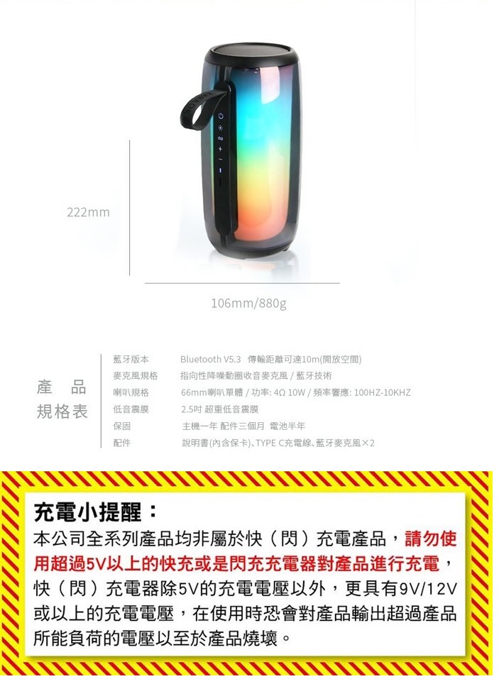 ◆ 操作方式:喇叭:開機/ 燈效/ 播放/ 上一首(音量加)/ 下一首(音量減) 五個實體按鍵