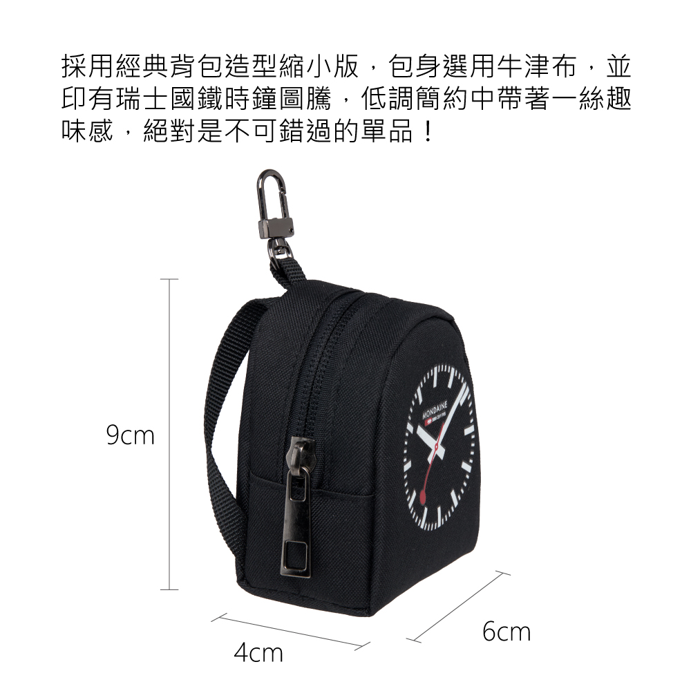 這款迷你後背包採用經典背包造型縮小版,尺寸為長9 x 寬6 x 底寬4cm,外型精緻小巧,但內部空間足夠放入日常小物,實用性滿分!包身選用牛津布,並印有瑞士國鐵時鐘圖騰,低調簡約中帶著一絲趣味感,完美結合時尚設計與實用功能,絕對是不可錯過的單品!