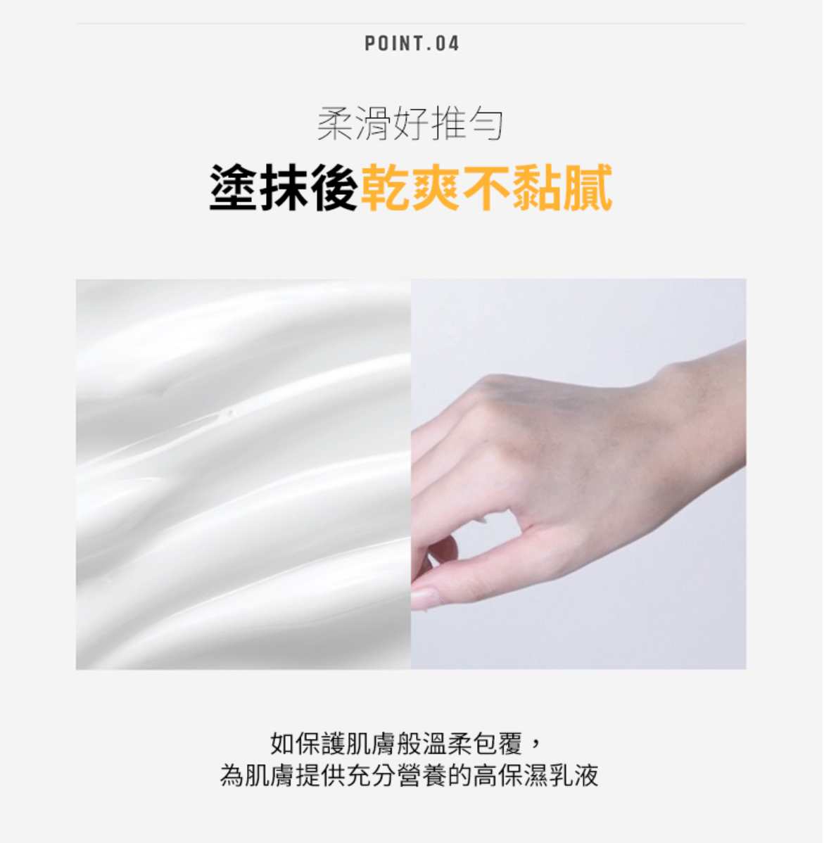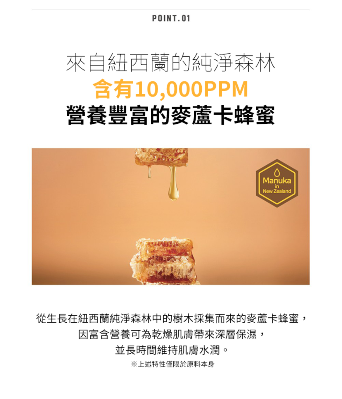 採用MLE仿生技術修復肌膚屏障,富含蜂蜜萃取精華,長效保濕、舒緩乾燥,