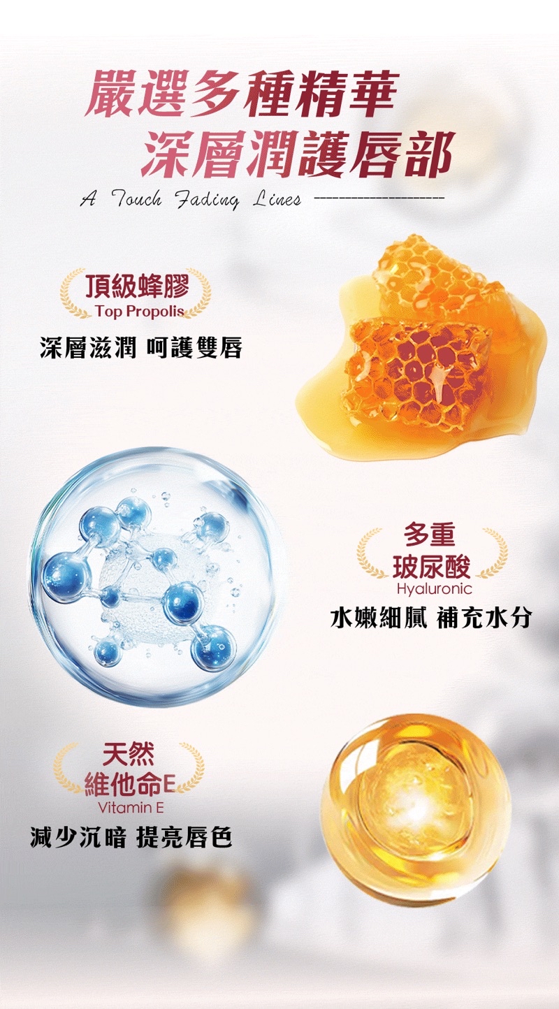✤極致修護 | 全新獨家配方,頂級級蜂膠保養、乳木果油成分添加,可舒緩滋潤唇瓣和撫平唇紋,長效維持水潤妝效。