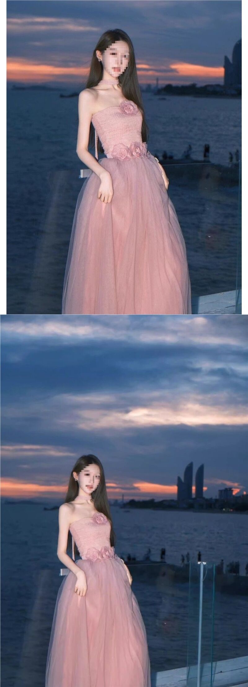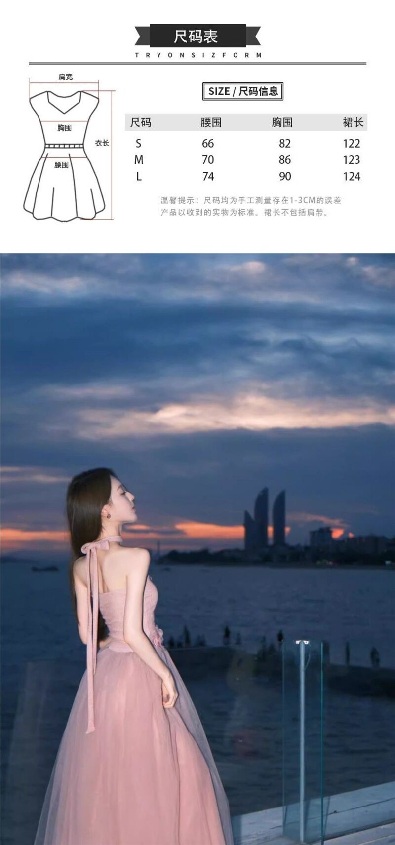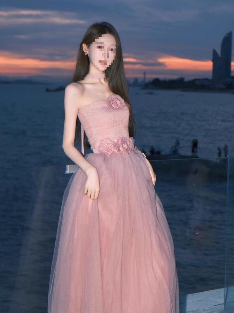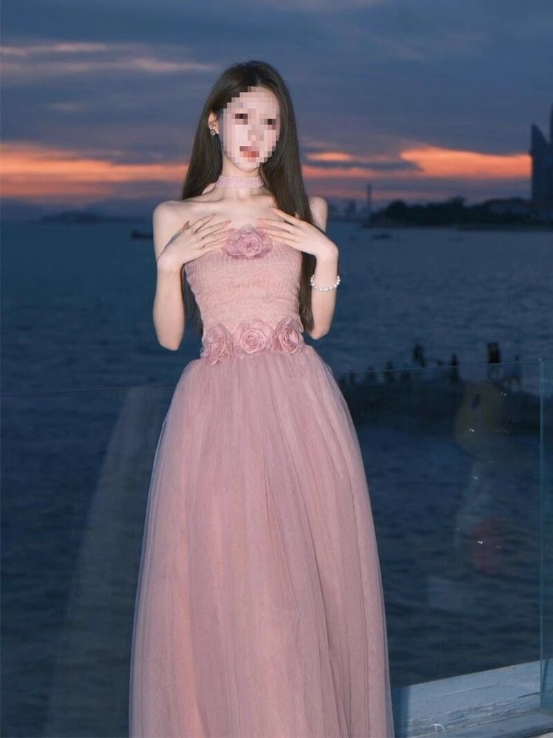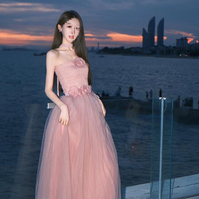 粉色甜美抹胸裙生日晚宴晚禮服輕奢小眾收腰連衣裙女夏季氣質長裙