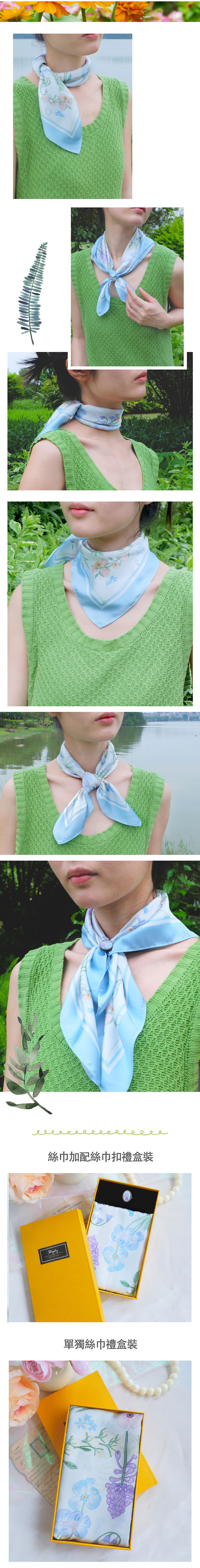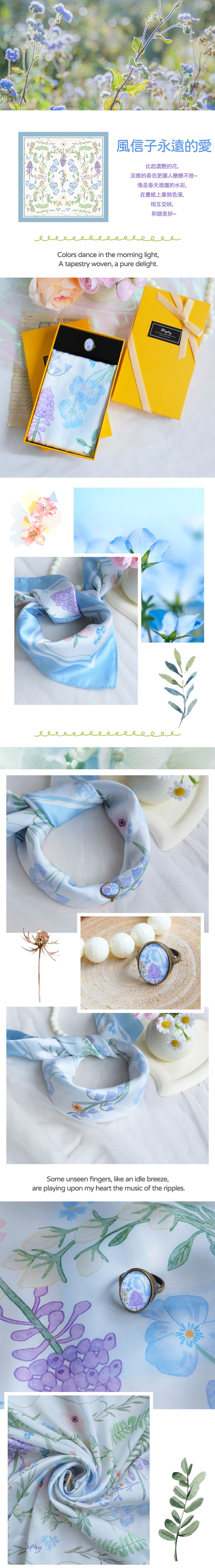 絲巾手繪設計展現了生動的風信子花朵,花朵盛開,色彩鮮艷,包括紫色、藍色、粉色和白色,反映了植物的自然之美。風信子絲巾可以通過多種方式搭配:圍繞頸部系成優雅的結,披在肩上增加溫暖,或用作頭巾,讓整體造型更具趣味性。它既適合休閒服裝,也能與正式服飾完美搭配,成為你衣櫥中的多功能配飾。