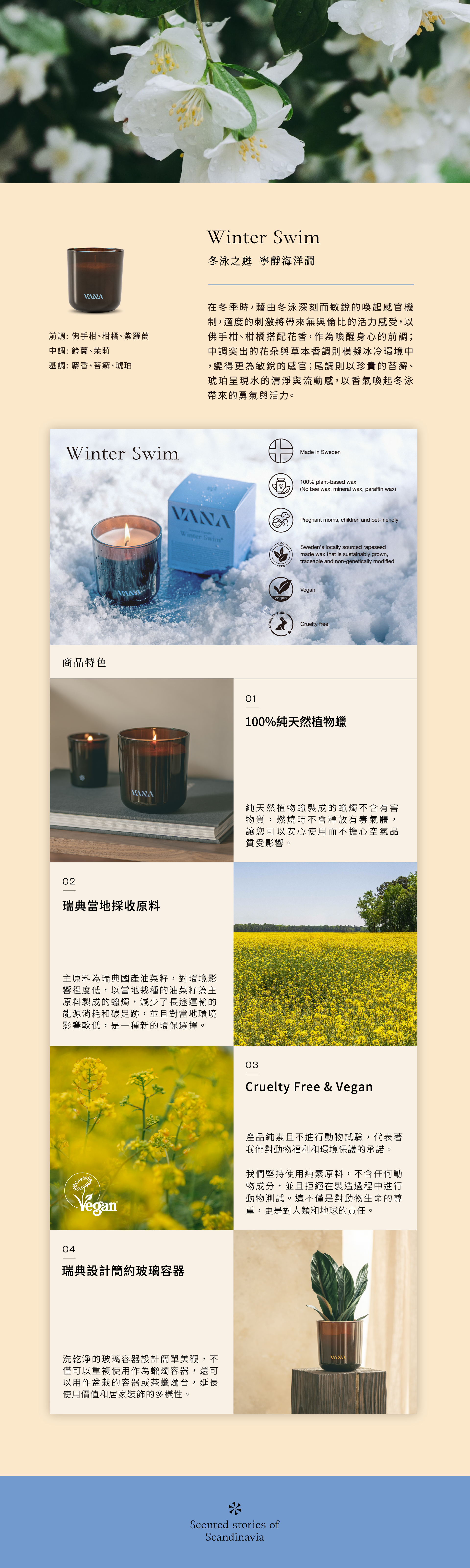 在冬季時,藉由冬泳深刻⽽敏銳的喚起感官機制,適度的刺激將帶來無與倫⽐的活⼒感受,以佛⼿柑、柑橘搭配花⾹,作為喚醒⾝⼼的前調;中調突出的花朵與草本⾹調則模擬冰冷環境中,變得更為敏銳的感;尾調則以珍貴的苔癬、琥珀呈現⽔的清淨與流動感,以⾹氣喚起冬泳帶來的勇氣與活⼒。