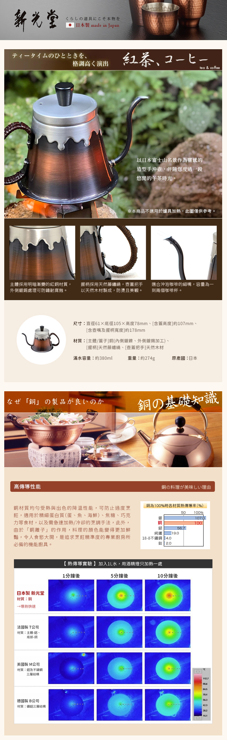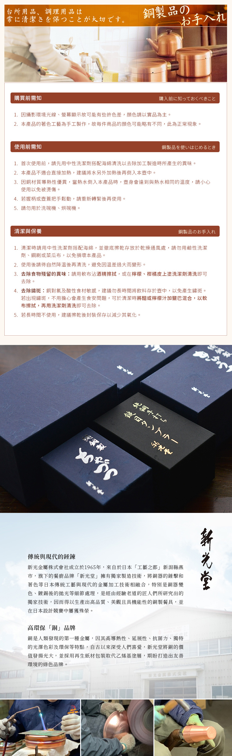 材質:[主體/蓋子]銅(內側鍍鎳、外側鍍錫加工)、[握柄]天然藤蔓纏繞、[壺蓋把手]天然木材