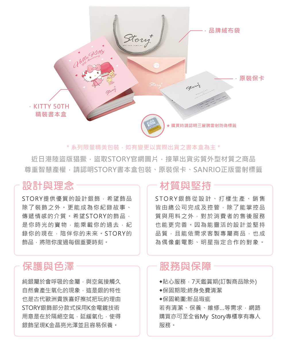– 包裝: Hello Kitty精裝書本盒+絨布袋+紙袋+雷射防偽貼紙+商品保固卡