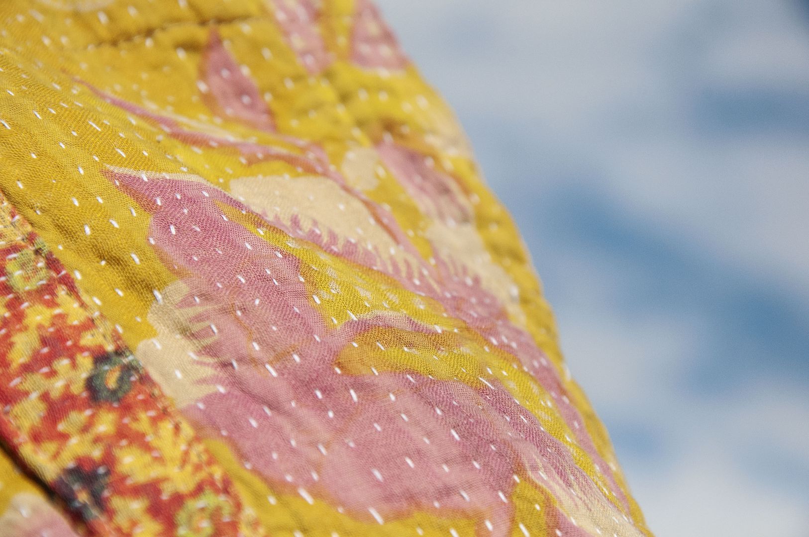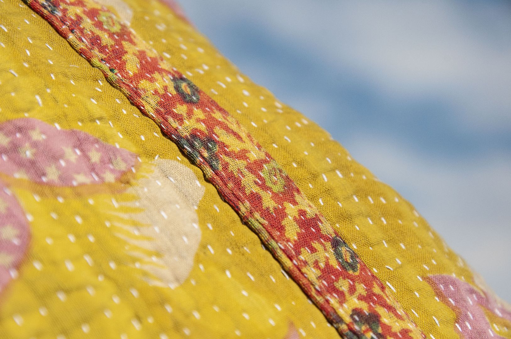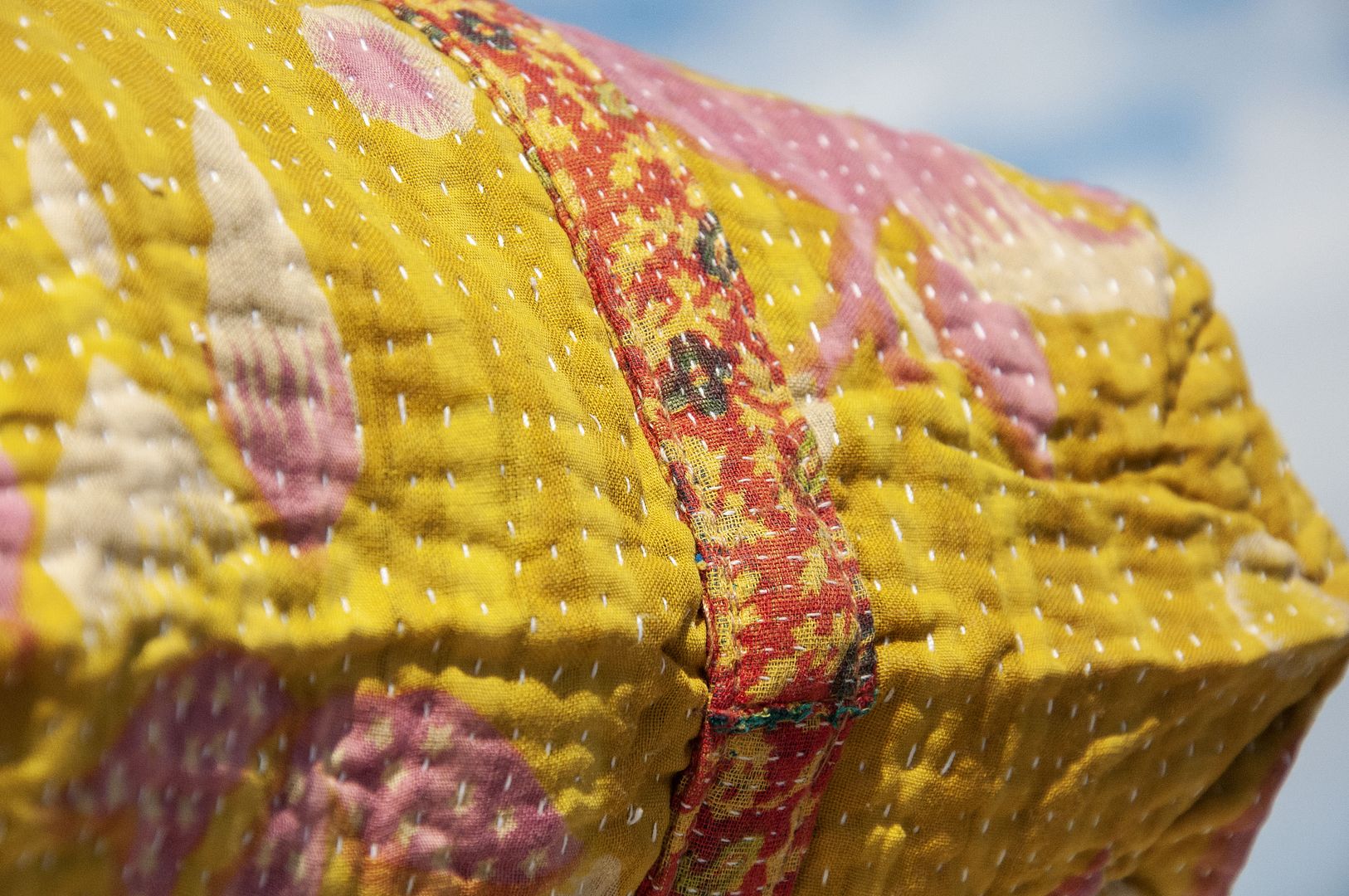 ▲來自印度沙漠地區的gudri刺繡工法,嚴選印度回收紗麗布+棉線,皆是手工一針一線刺繡,搭配了厚實的純棉布料,充滿古布的樸實手感