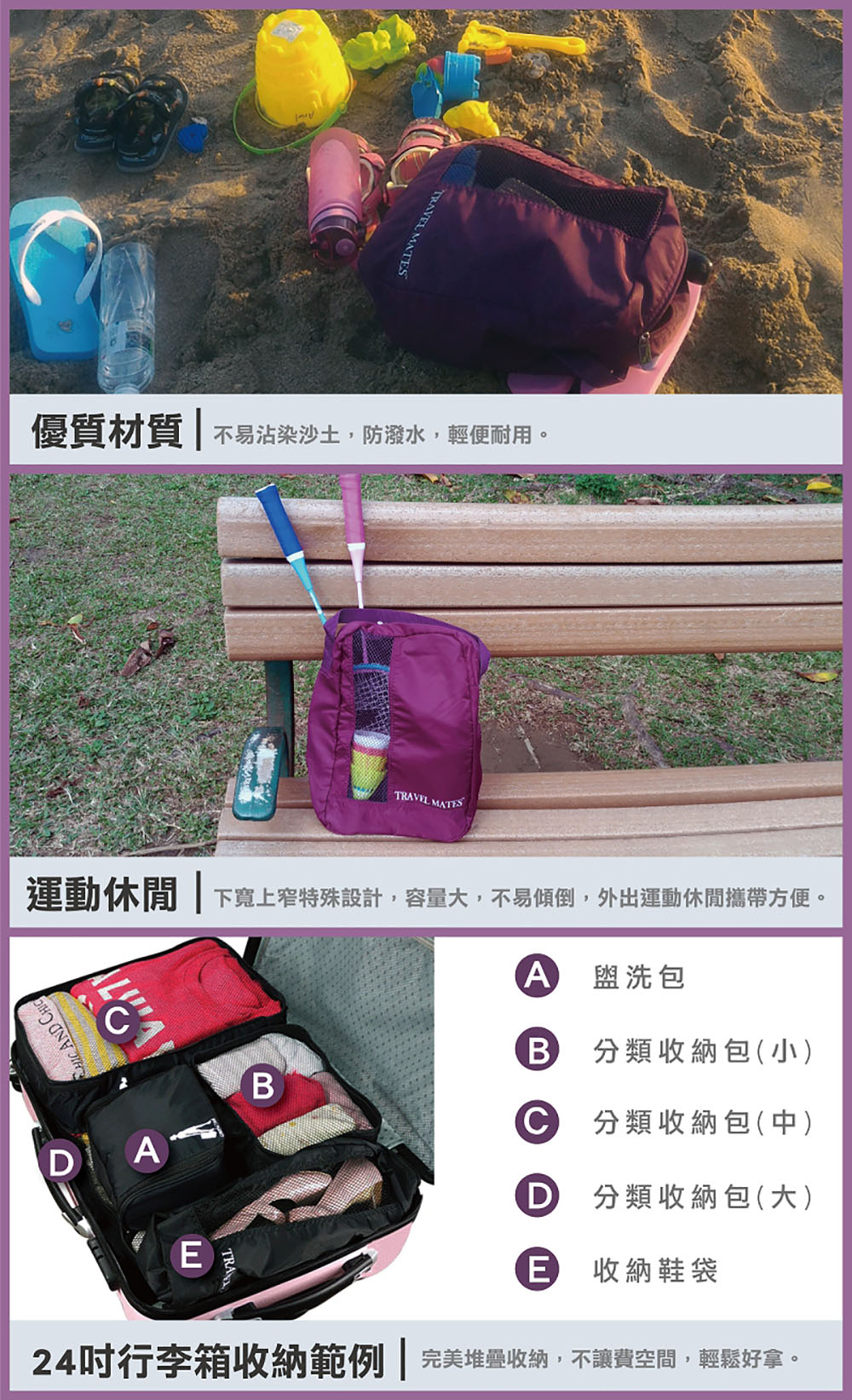 可收納內衣褲,襪子,手帕或是圍巾手套,泳衣蛙鏡等。