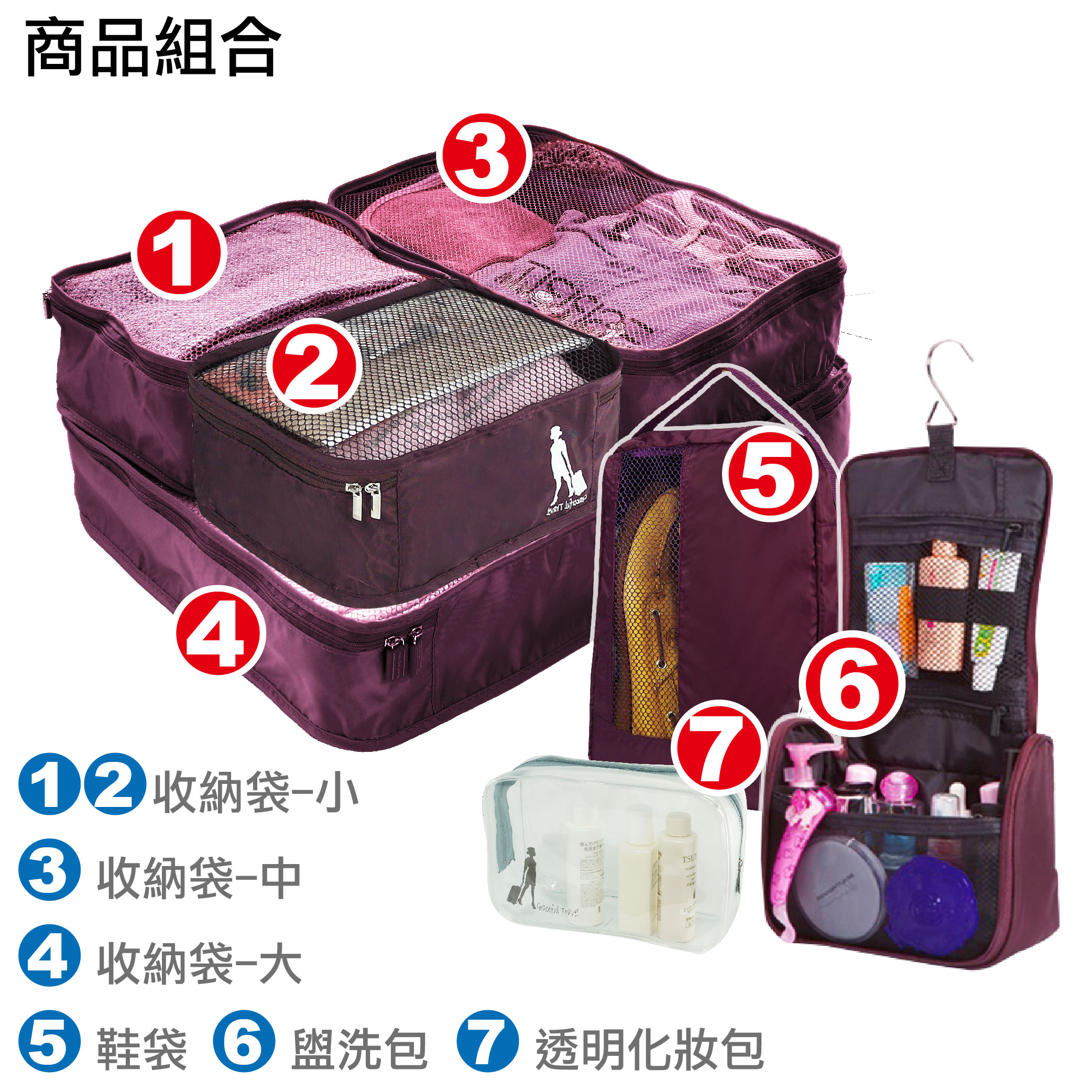 盥洗包x1、透明化妝包x1、鞋袋x1,共7件組
