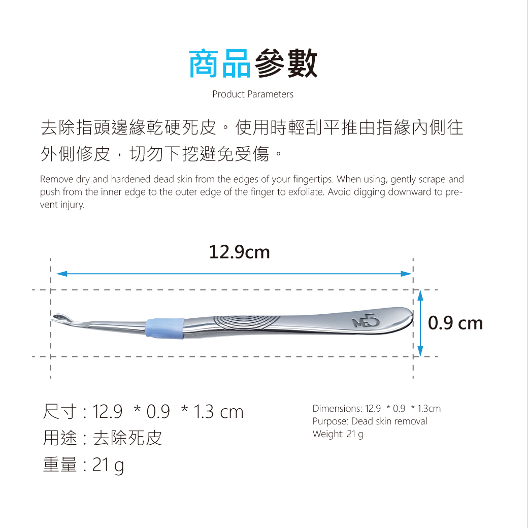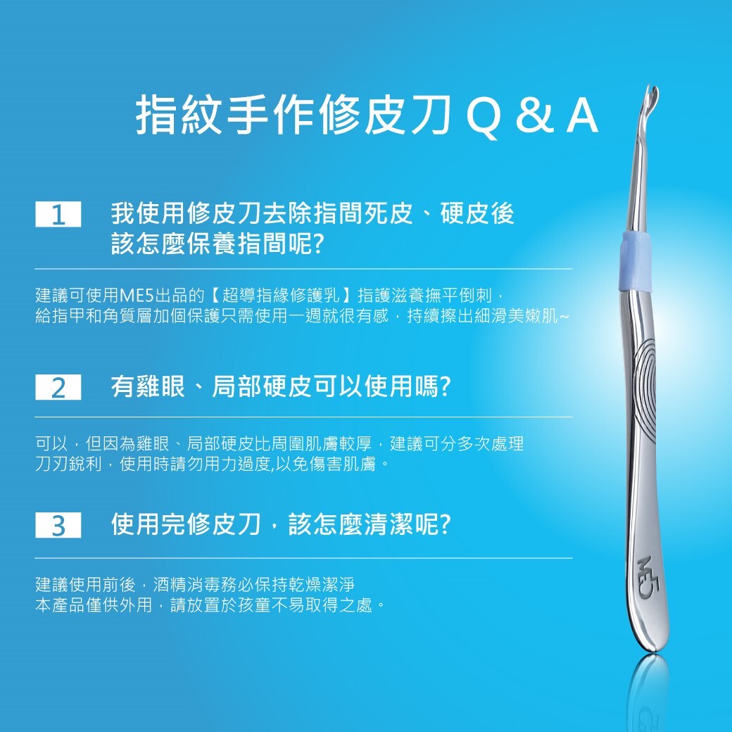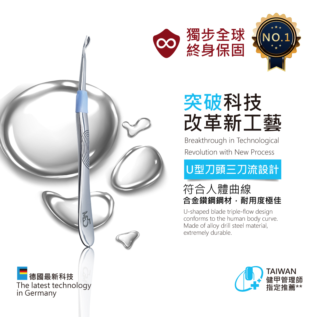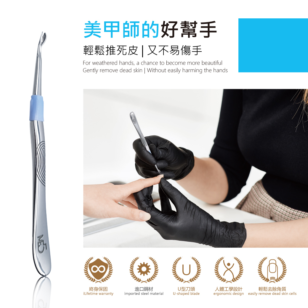 產品特點:"健甲管理師指定推薦",德國最新科技改革新工藝 ,U型刀頭三刀流設計,符合人體曲線,合金鑽鋼鋼材一體成型,耐用度提升 輕鬆推死皮又不易傷手,可改善指頭邊緣乾硬死皮,和局部硬皮厚繭。 使用時輕刮平推由往指緣內側往外側修皮,切勿下挖避免受傷。