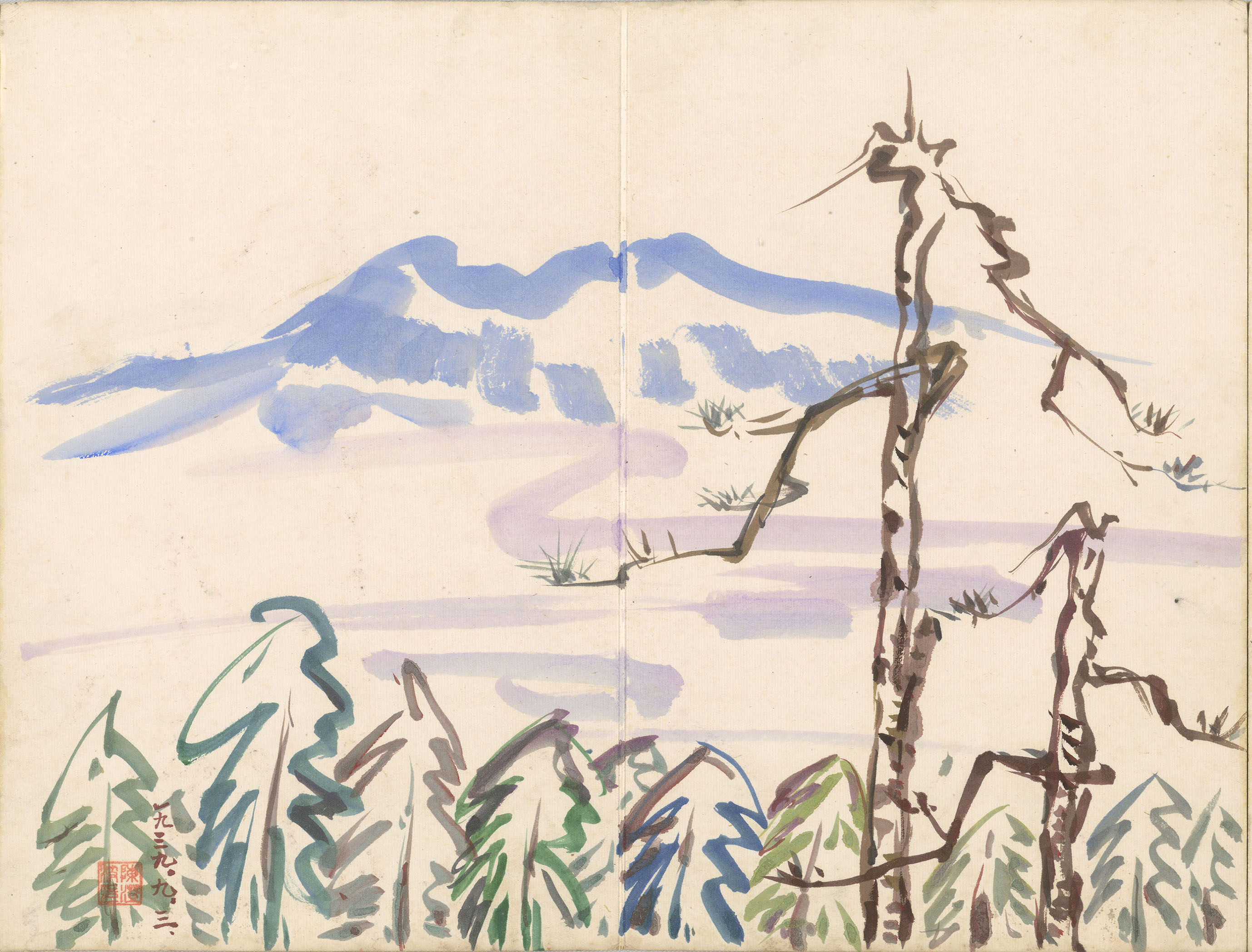 此幅難得的水彩畫作,是陳澄波在大女兒的婚宴中,於貴賓簿上留下的山景速寫。
