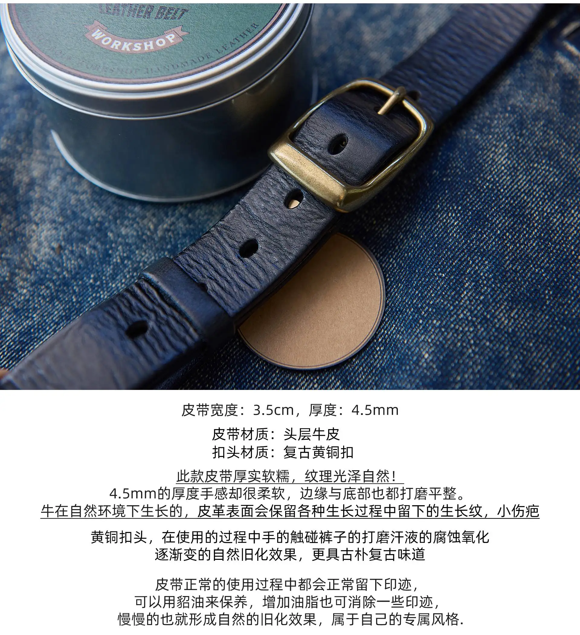 天然真皮紋理 黃銅扣 厚實的頭層牛皮 軟糯細膩 3.5cm寬皮帶