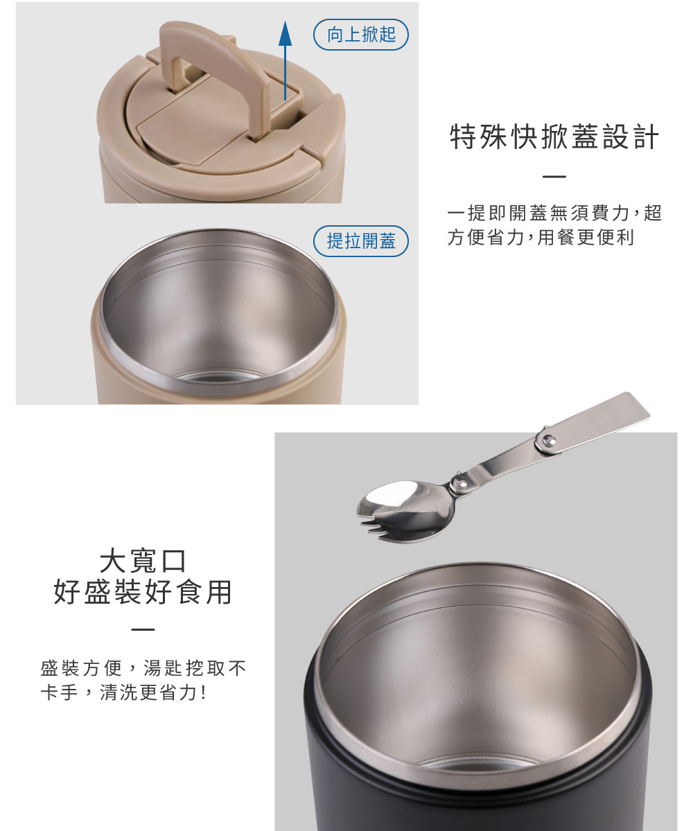 快掀不鏽鋼真空保溫悶燒罐,採用食品級 304 不鏽鋼打造,雙層真空設計可保溫 7 小時、保冷 10 小時,熱粥、濃湯或冰涼甜品都能維持最佳口感。