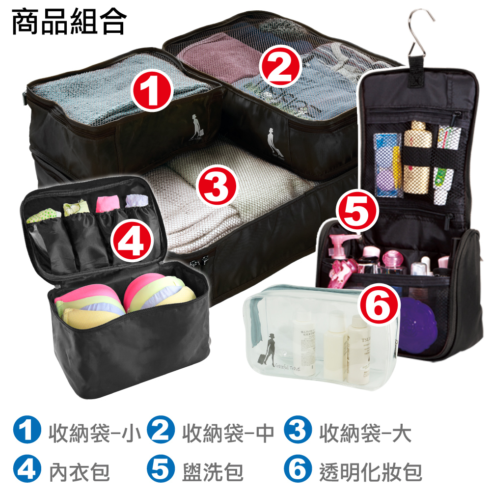 盥洗包x1、透明化妝包x1、內衣包x1,共6件組