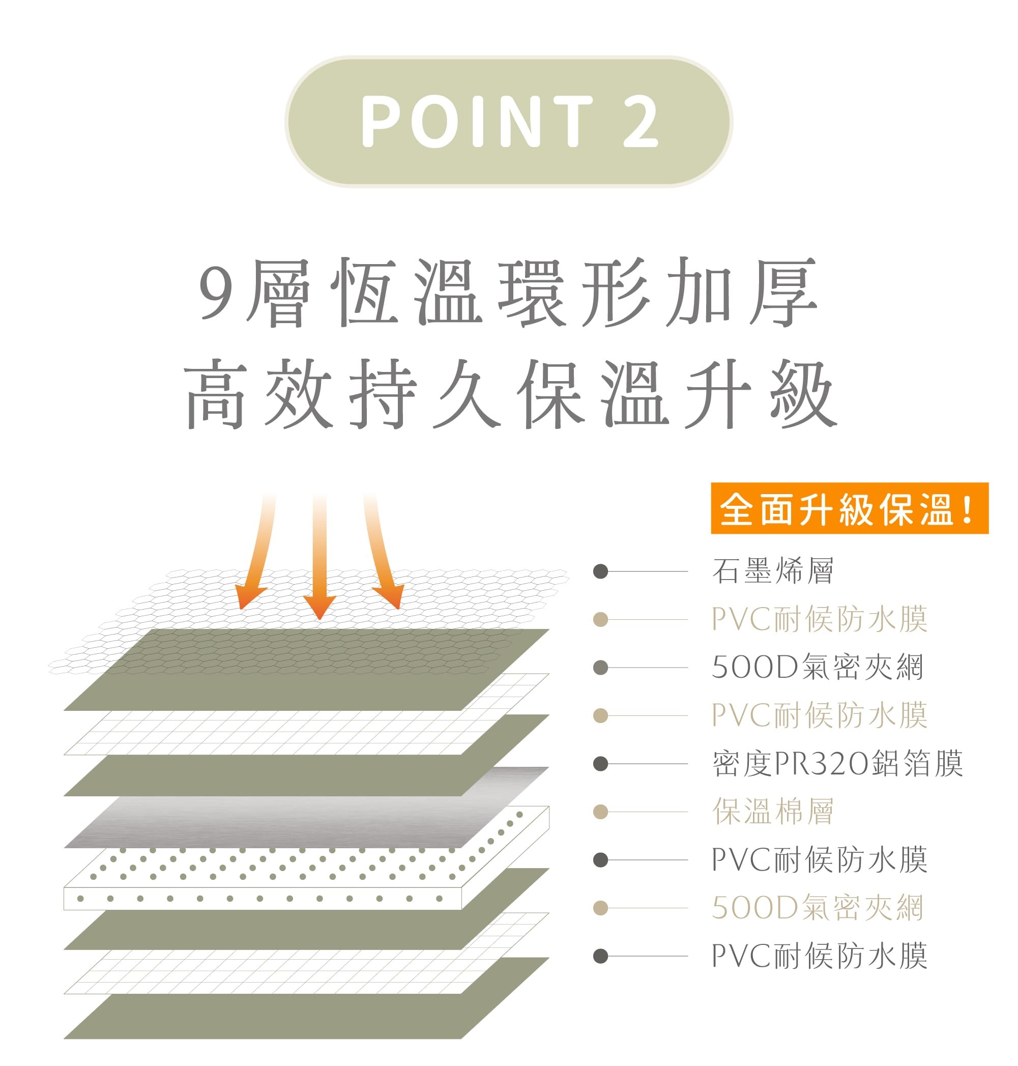 ∨ 9層加厚!上下層500D夾網PVC+石墨烯+內層鋁箔層+保溫棉,持久保溫!保暖升級!