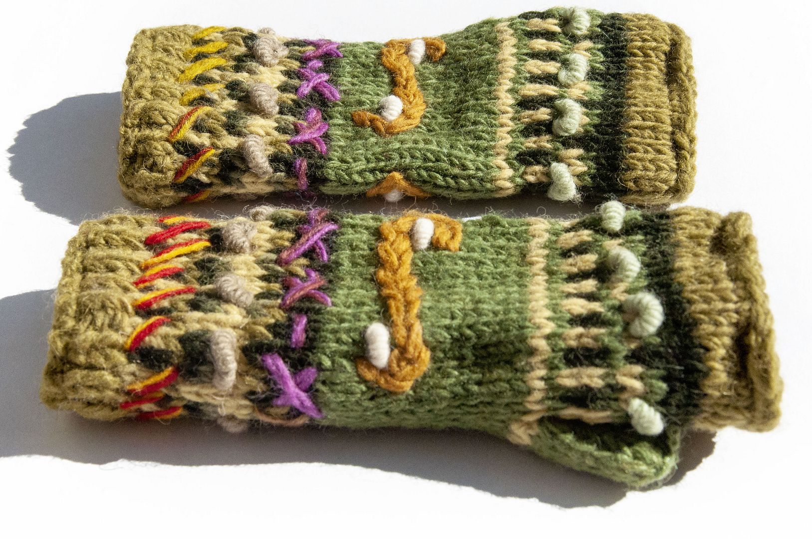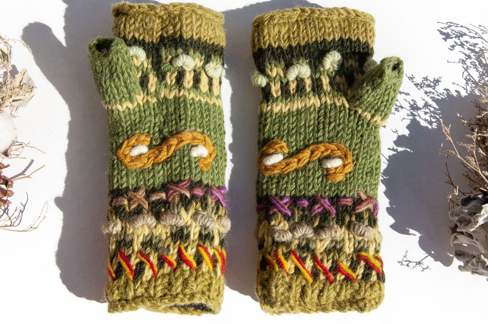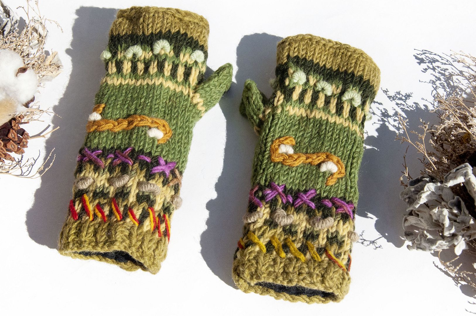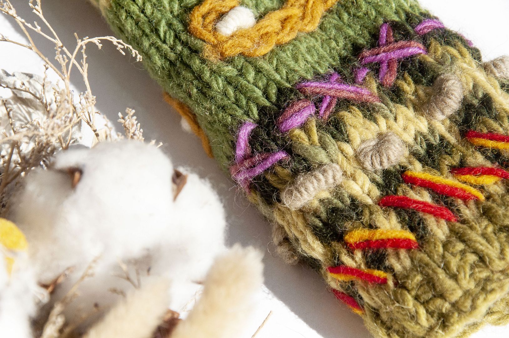 手織純羊毛針織手套/露趾手套/內刷毛手套/保暖手套-立體花朵刺繡