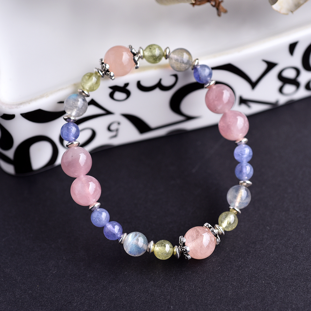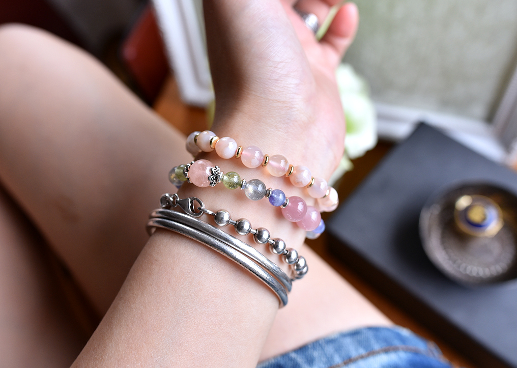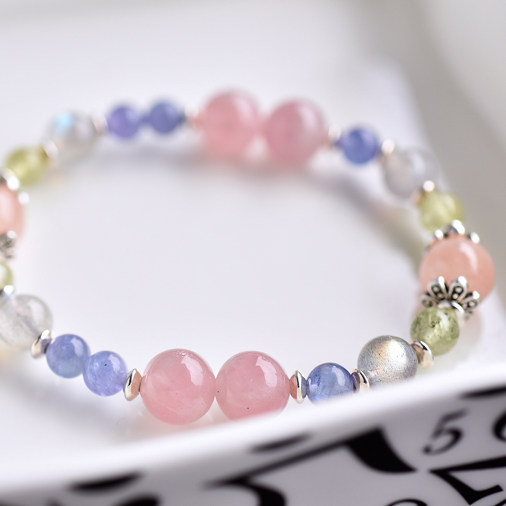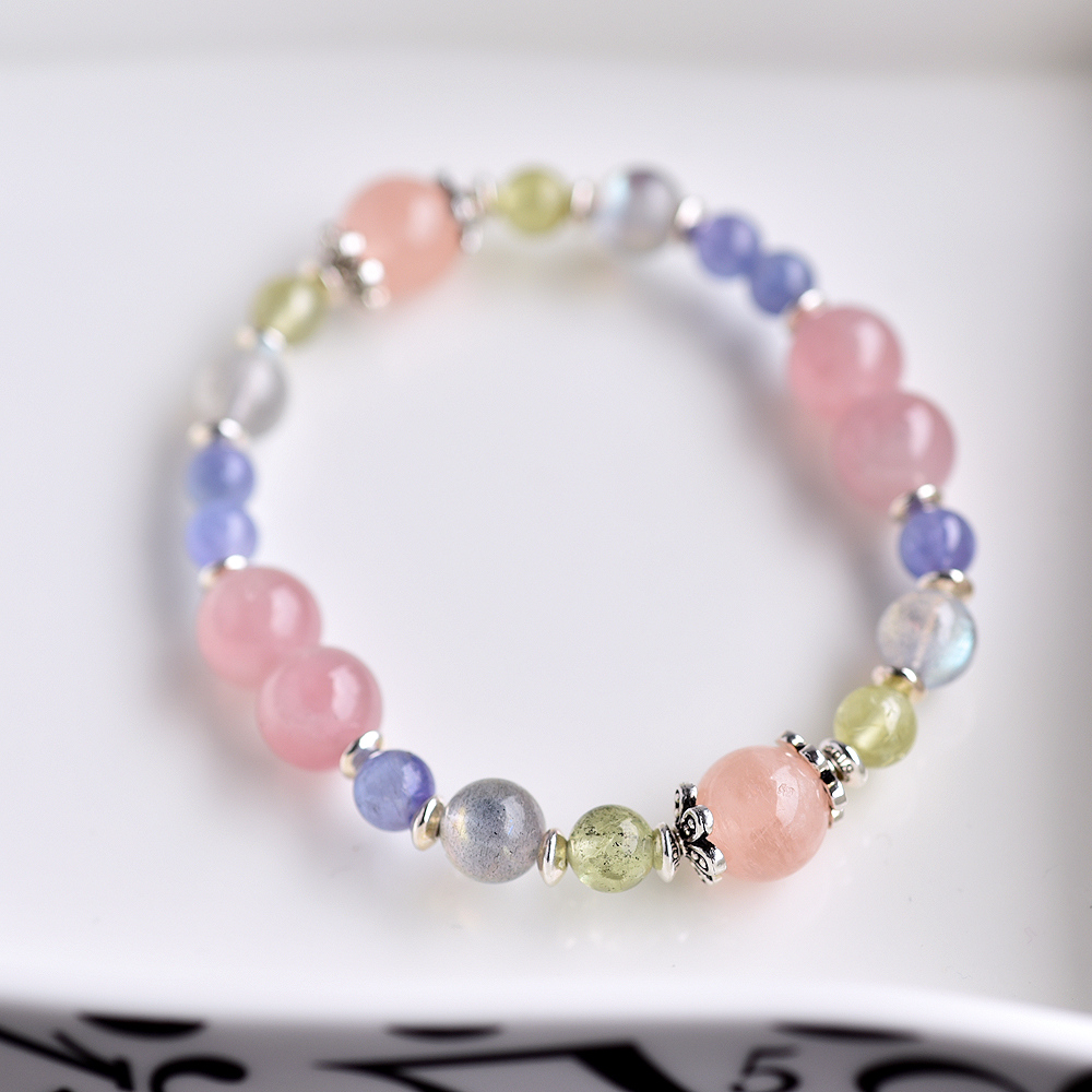 摩根石+丹泉石+拉長石+石榴石+馬島粉晶純銀手鍊