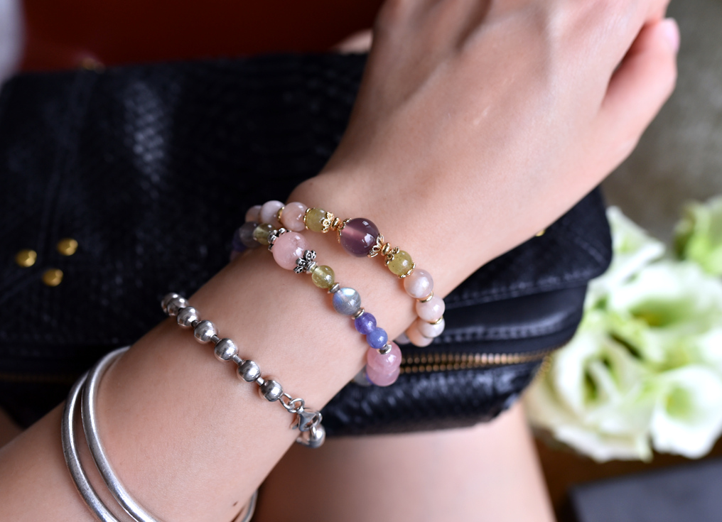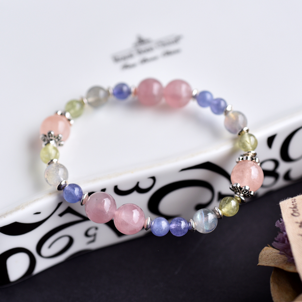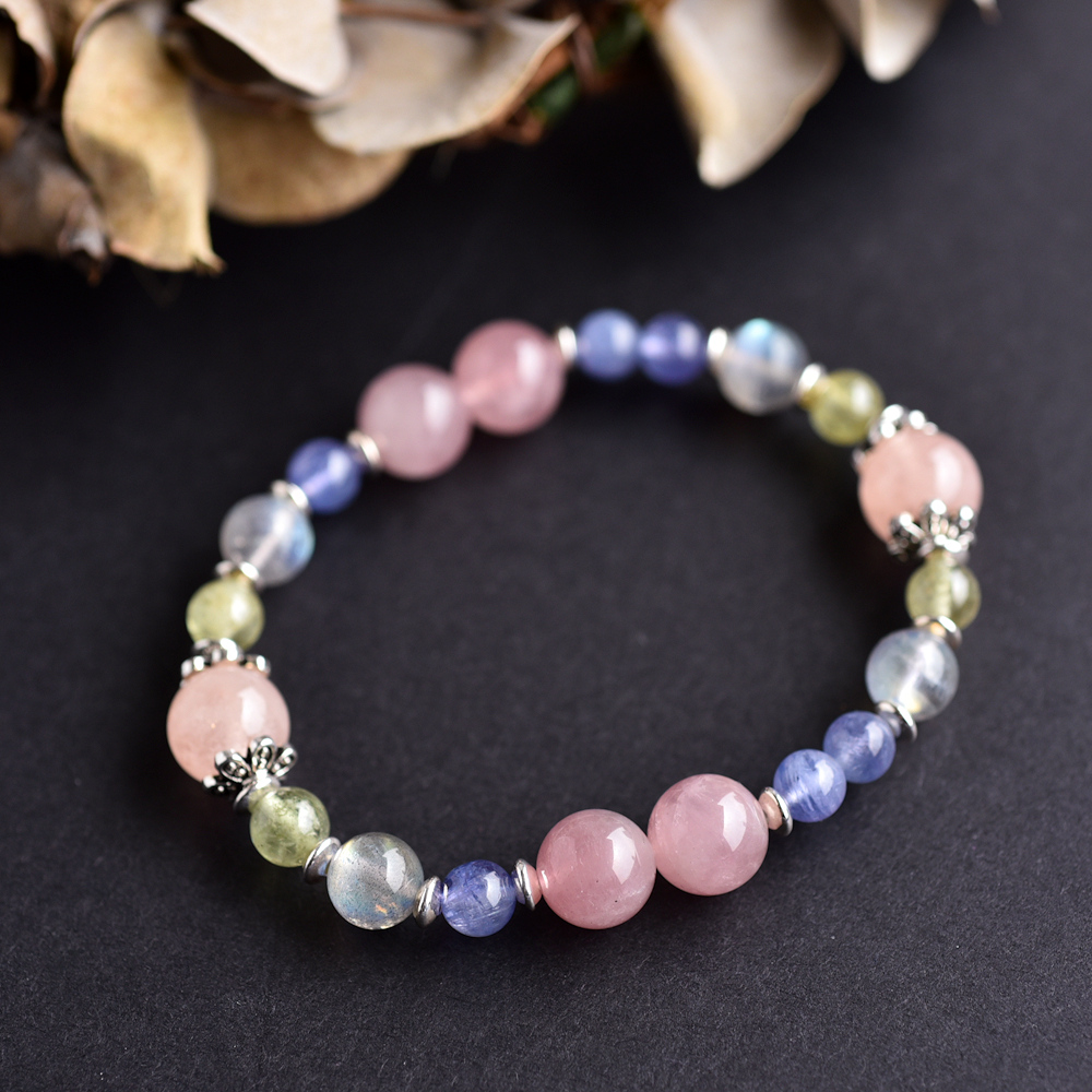 摩根石+丹泉石+拉長石+石榴石+馬島粉晶純銀手鍊