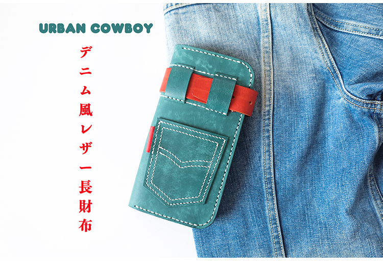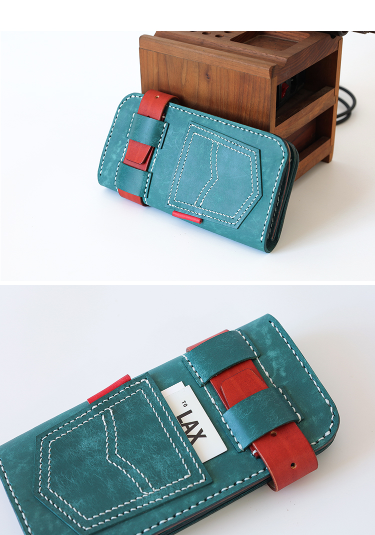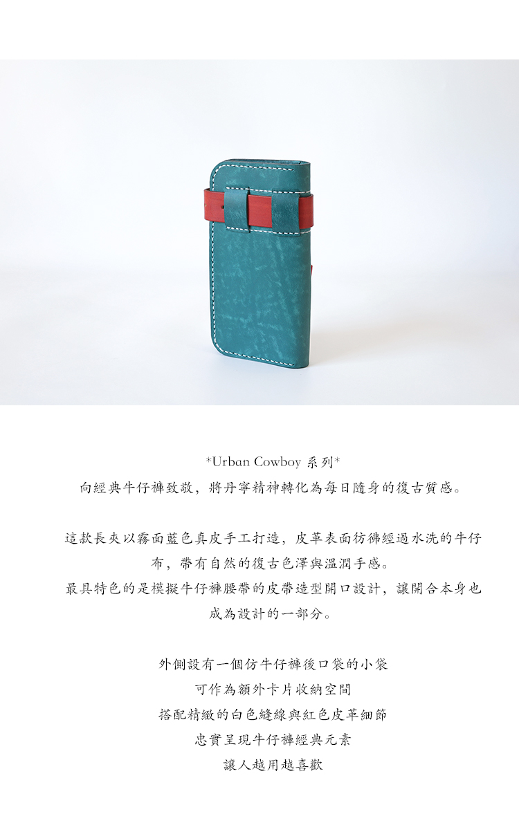 這款長夾以霧面藍色真皮手工打造,皮革表面彷彿經過水洗的牛仔布,帶有自然的復古色澤與溫潤手感。