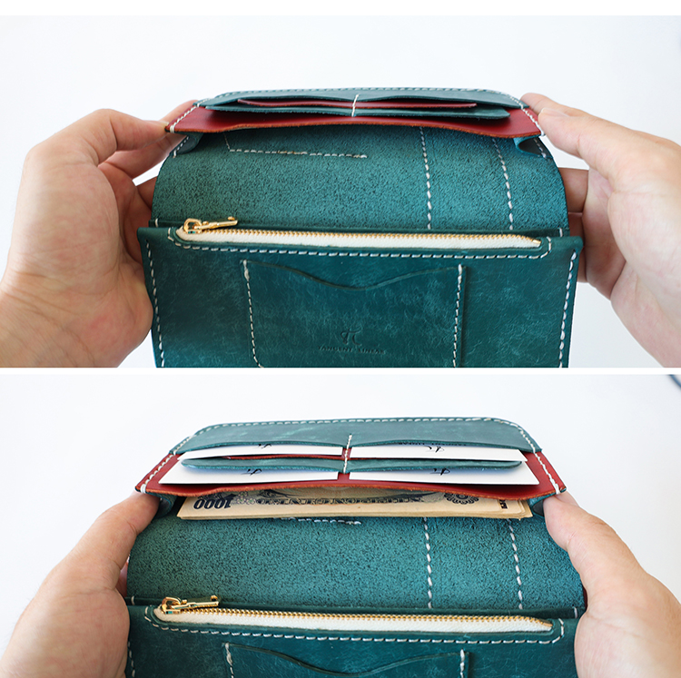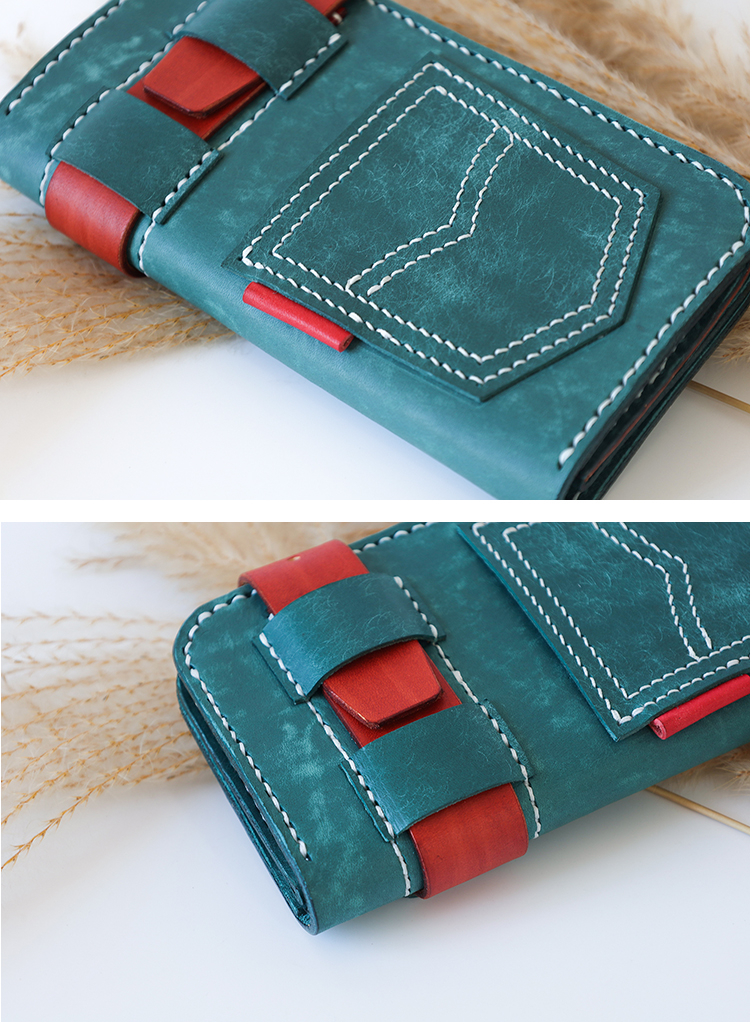 外側設有一個仿牛仔褲後口袋的小袋,可作為額外卡片收納空間,搭配精緻的白色縫線與紅色皮革細節,忠實呈現牛仔褲經典元素,讓人越用越喜歡。
