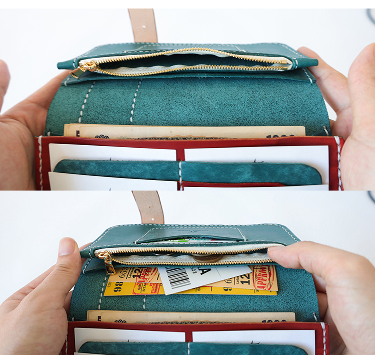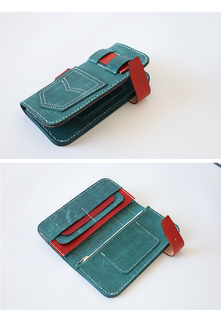 我们没有采用缝纫机来制作我们的产品,所有产品都是纯手工缝制出来的。在缝制之前,需要用特制的菱斩在皮革上敲打出缝线孔,只有这样才能缝制出漂亮的波浪型缝线效果,这也是和机台缝线最大的不同之处。虽然这样会大大增加皮具的生产时间,但这也是皮革匠人给予皮具灵魂和温润手感的重要步骤。