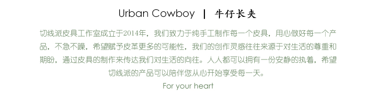 “切线派”目前选用的牛皮全部来自意大利的A级多脂植鞣革。由于是天然材质,并且制皮厂使用的加工方法是对皮质损伤最小的植鞣工艺,所以皮面上不可避免的有少量“伤痕”与“皱纹”以及“血筋”等。我们在开料的时候,会尽量避免,或把这些部分放在产品不明显的或非受力的部分。