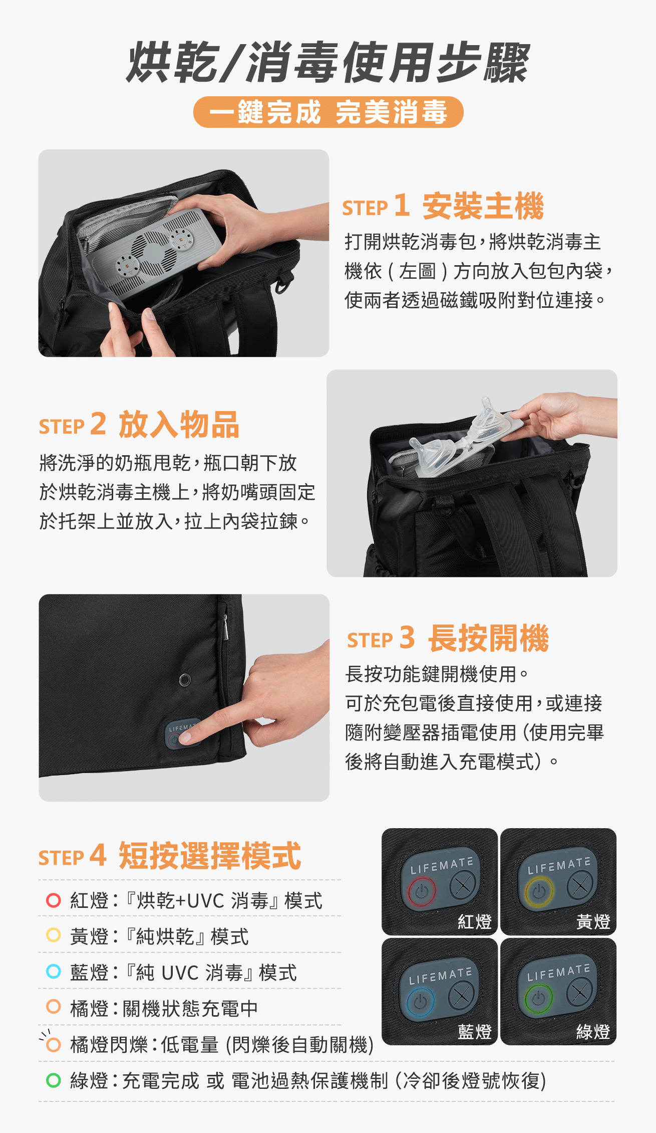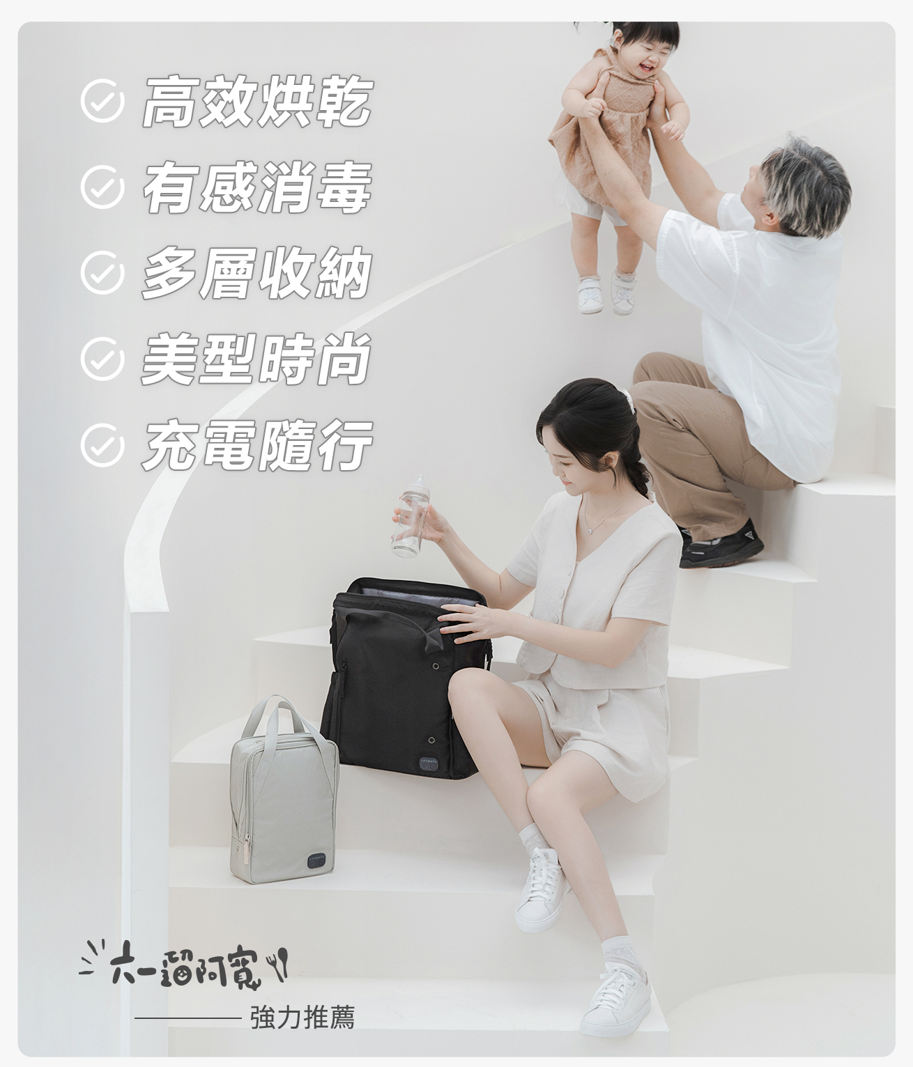 *包裝內含:包包x1、烘乾消毒主機x1、托架x1、使用說明書x1、電源供應器x1