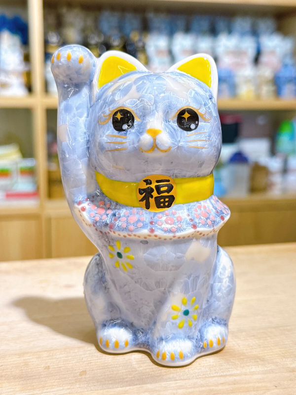 招財貓表面使用花結晶釉,展現出獨特的結晶效果,增添了藝術感和層次感。釉面光滑,透出自然的光澤,使整體看起來更具質感。清水燒的招財貓不僅是家居裝飾品,更是一件高雅的藝術品,展示了精湛的工藝技術和文化內涵。