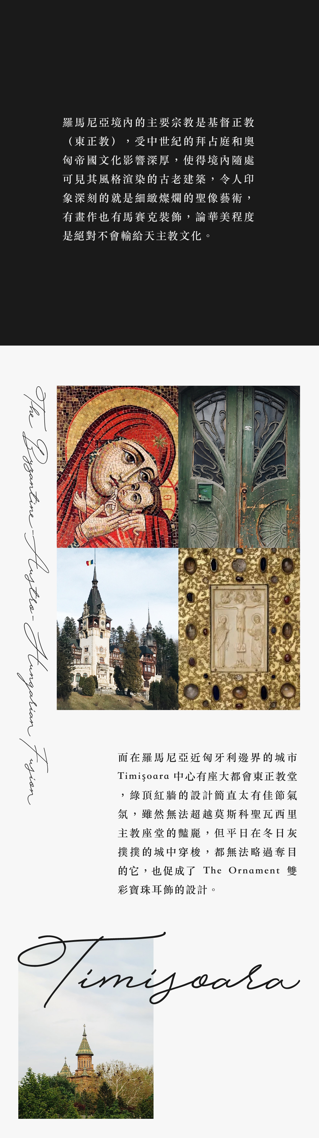 而在羅馬尼亞近匈牙利邊界的城市 Timișoara 中心有著一座大都會東正教堂,綠頂紅牆的設計簡直太有佳節氣氛,雖然無法超越莫斯科聖瓦西里主教座堂的豔麗,但平日在冬日灰撲撲的城中穿梭,都無法略過奪目的它,也促成了雙彩寶珠耳飾的設計。