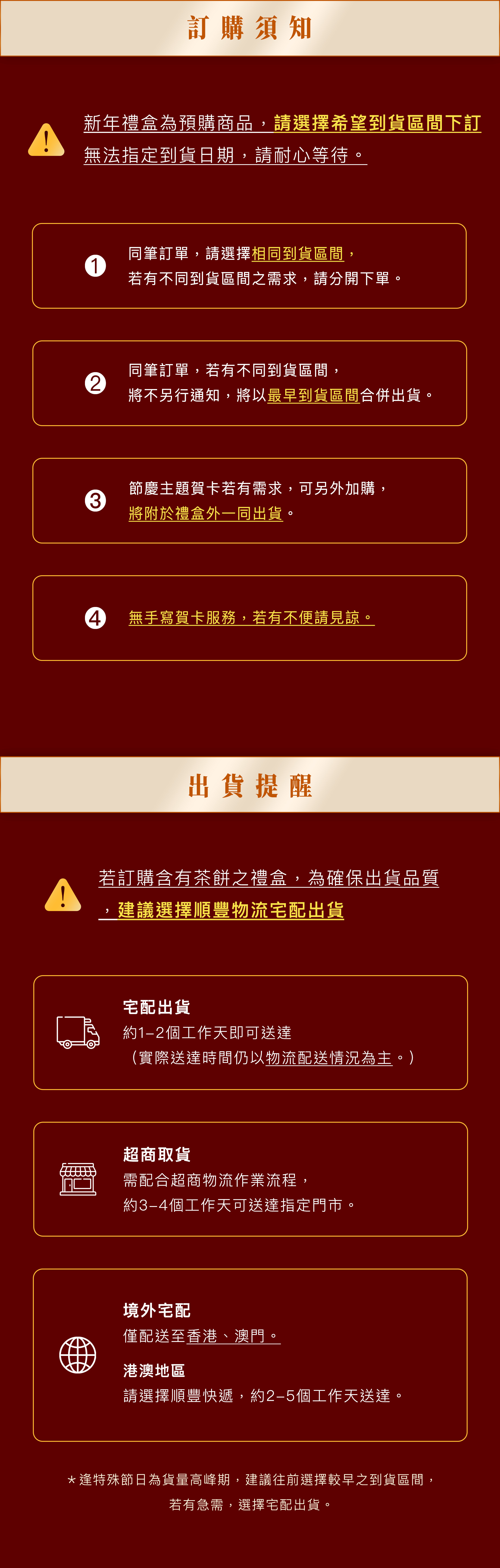 -訂購新年禮盒,整筆訂單將會於最早到貨區間出貨