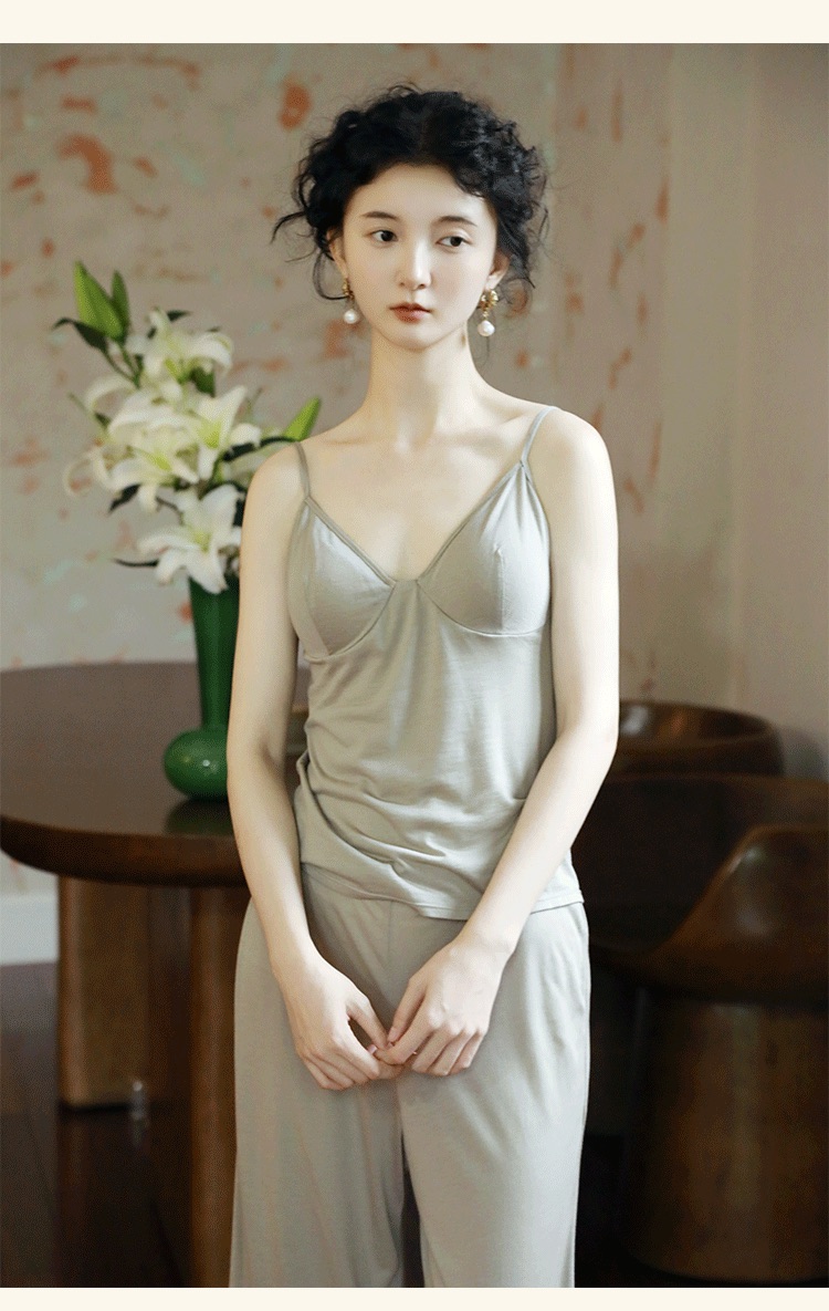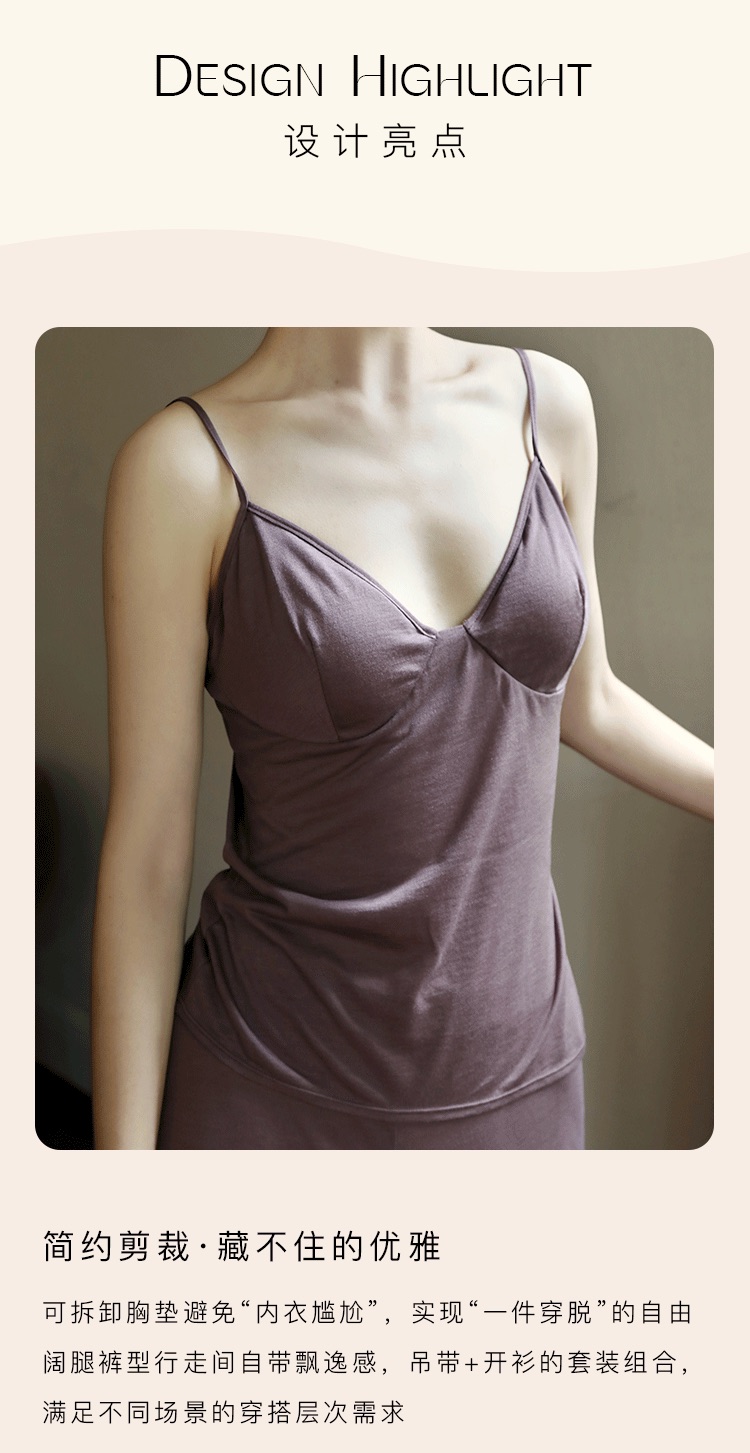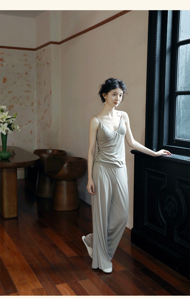 闊腿褲型行走間自帶飄逸感,吊帶 + 開衫的套裝組合,滿足不同場景的穿搭層次需求