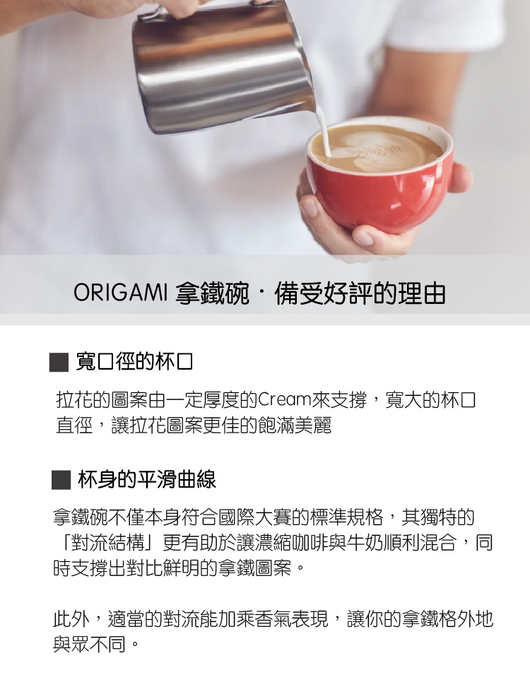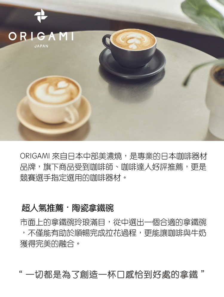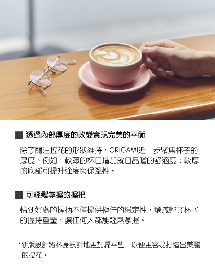 >>ORIGAMI注重支持品質的 "厚度"。根據表面調整,使杯子接觸嘴唇的部分夠薄,提供舒適唇部觸感。而底部較厚,提高強度、保溫性,讓每一口咖啡都是享受。