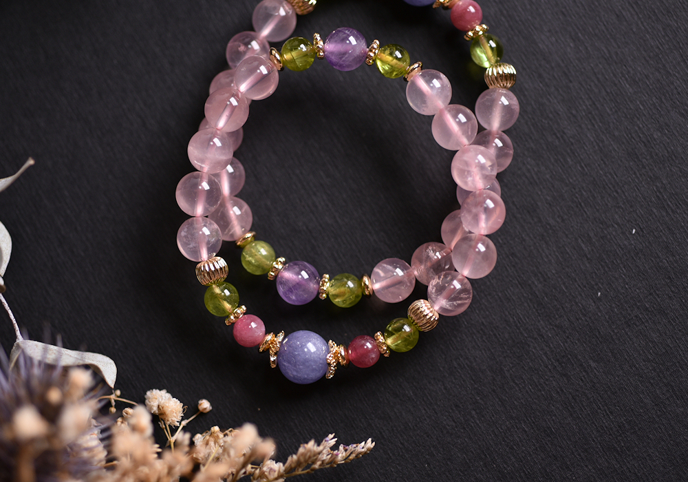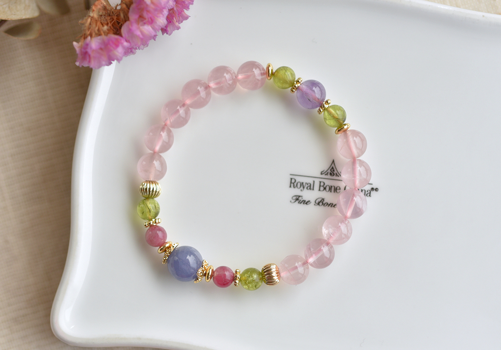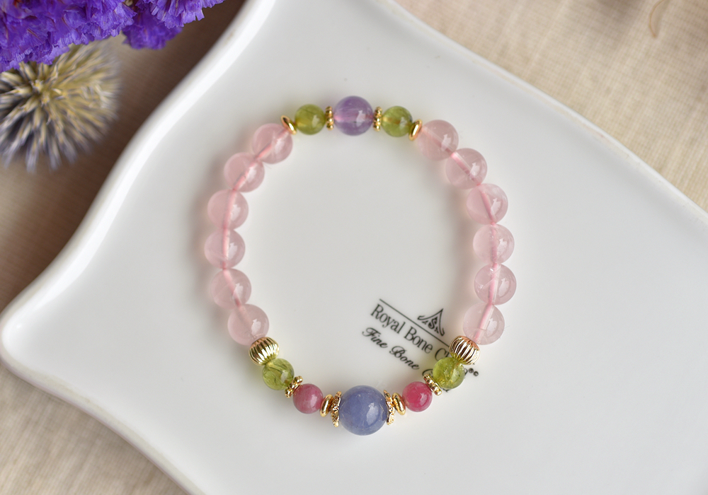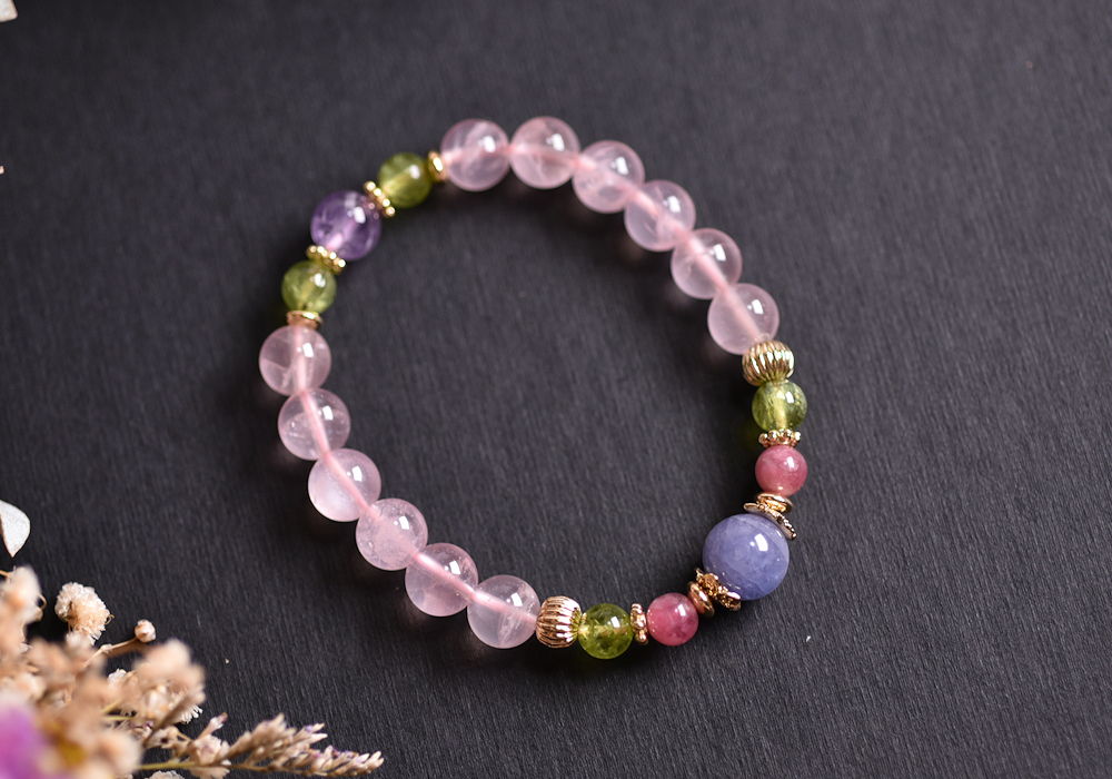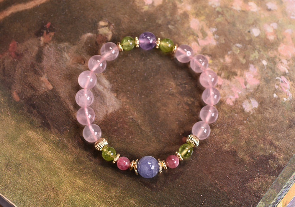 **粉晶+橄欖石+丹泉石+桃紅碧璽+薰衣草紫水晶鍍金手鍊**