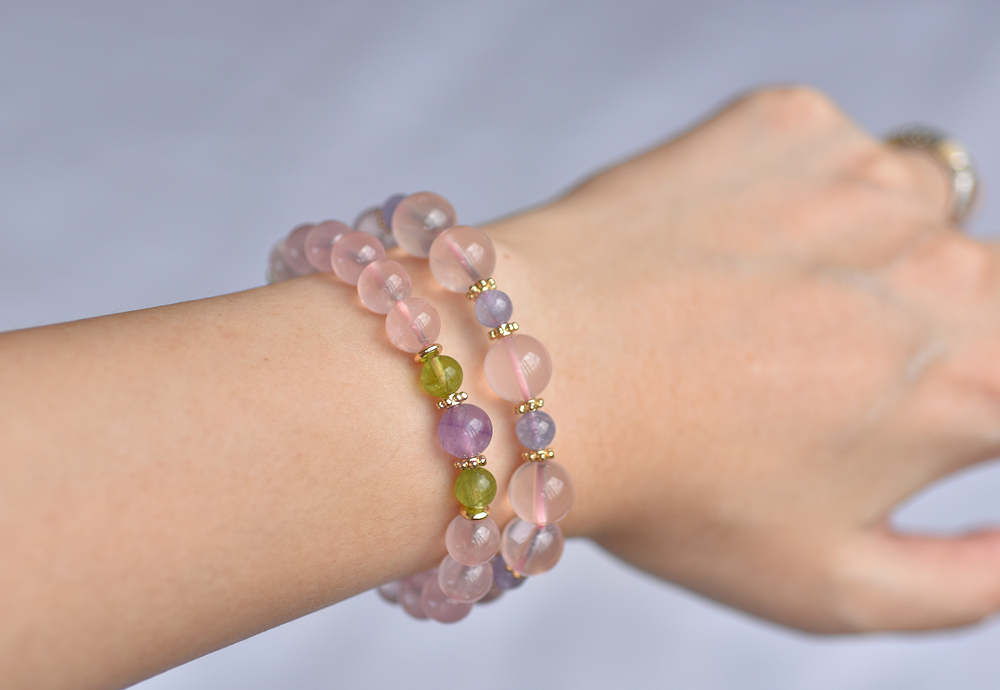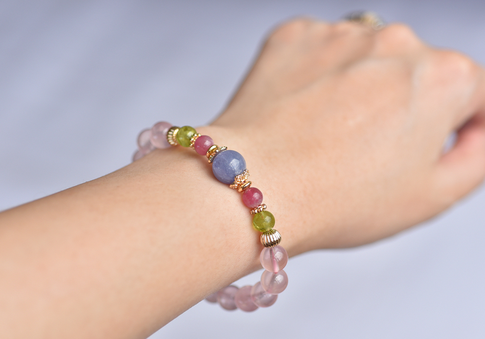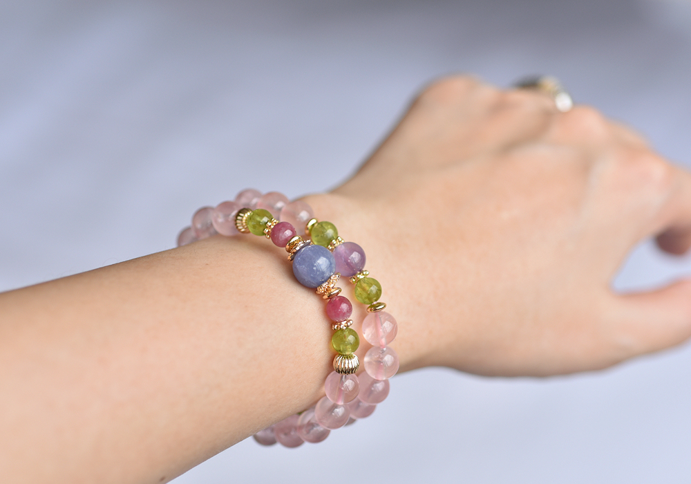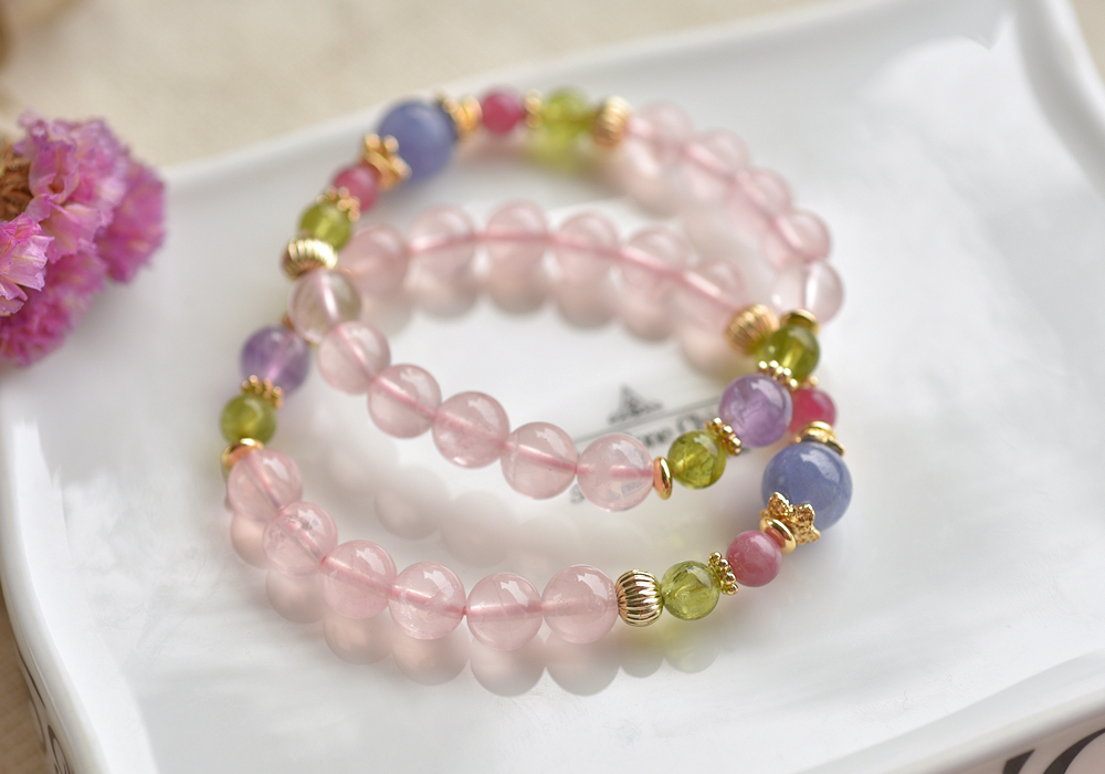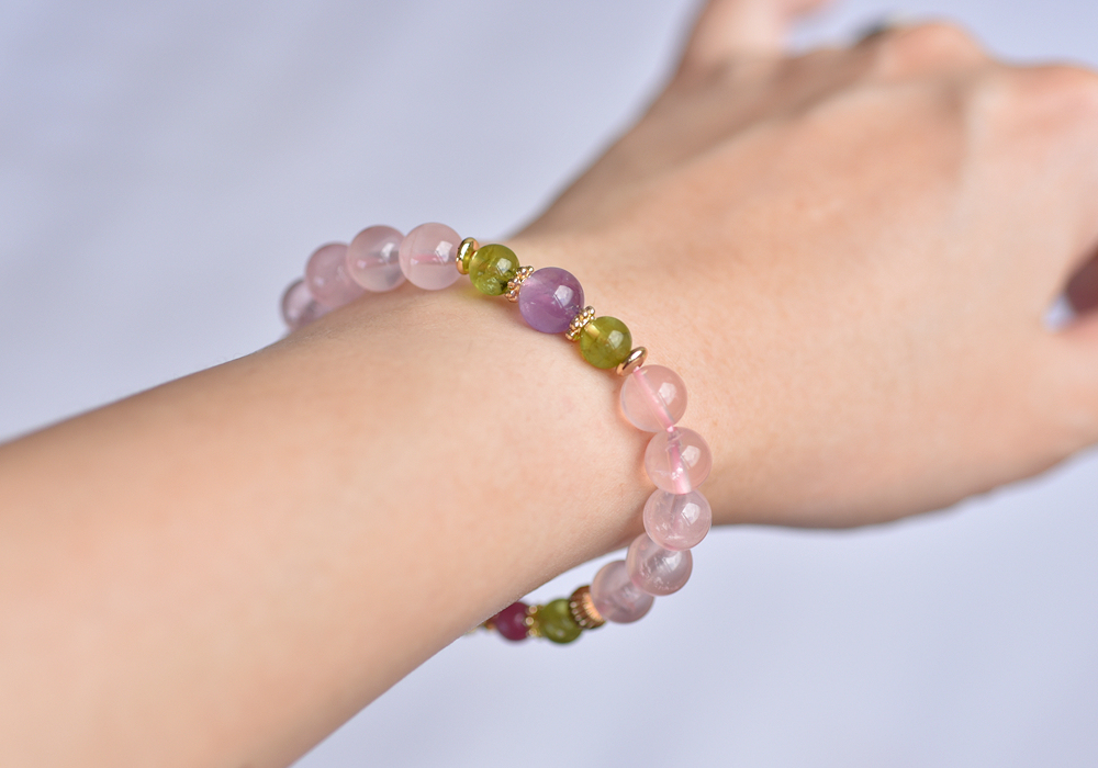 **粉晶+橄欖石+丹泉石+桃紅碧璽+薰衣草紫水晶鍍金手鍊**