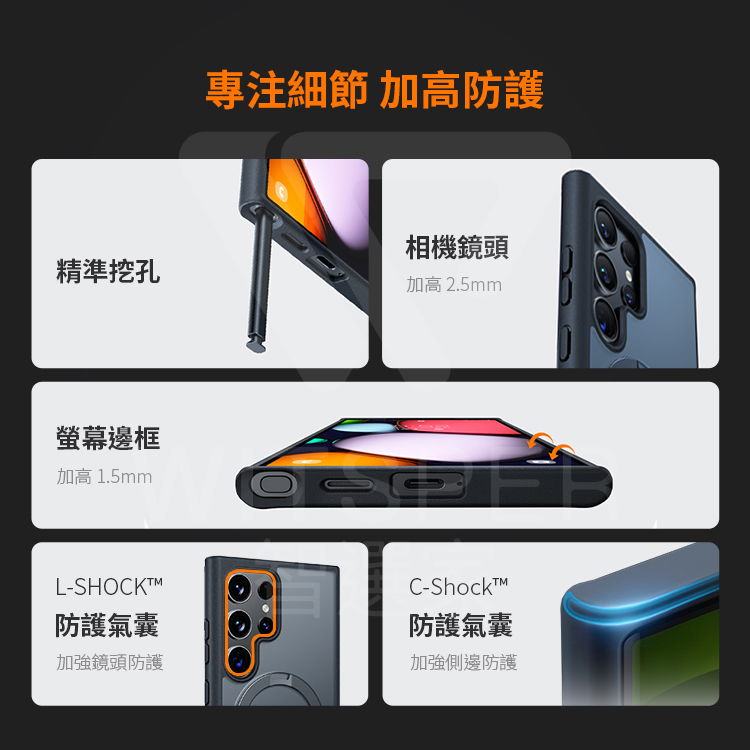 🔹專注細節 加高防護|螢幕、鏡頭邊框加高,採用緩震側框+C-Shock™四角加固結構,減緩掉落時 30%衝擊力,軍規級防摔安心使用