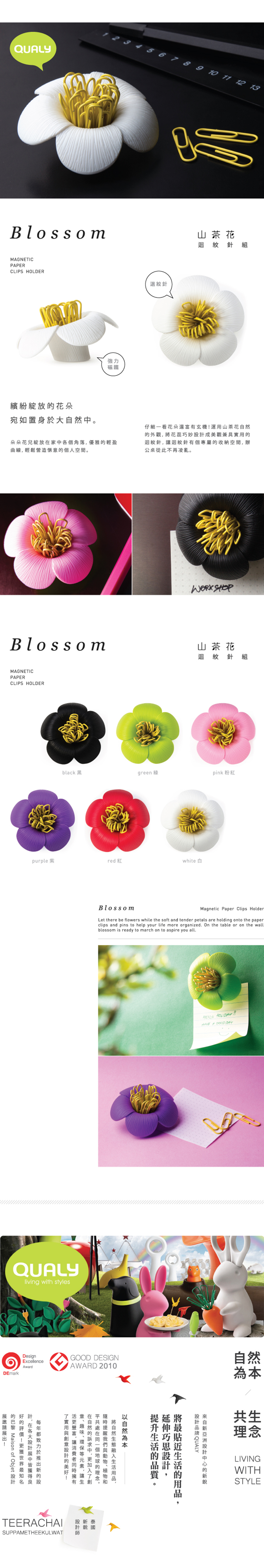 仔細一看花朵還富有玄機!運用山茶花自然的外觀,將花蕊巧妙設計成美觀兼具實用的迴紋針,讓迴紋針有個專屬的收納空間,辦公桌從此不再凌亂。純粹簡約的設計,同時背後也蘊含與大自然和平共處的理念,時時提醒我們走出戶外、隨手植栽,創造充滿綠意的健康生活。