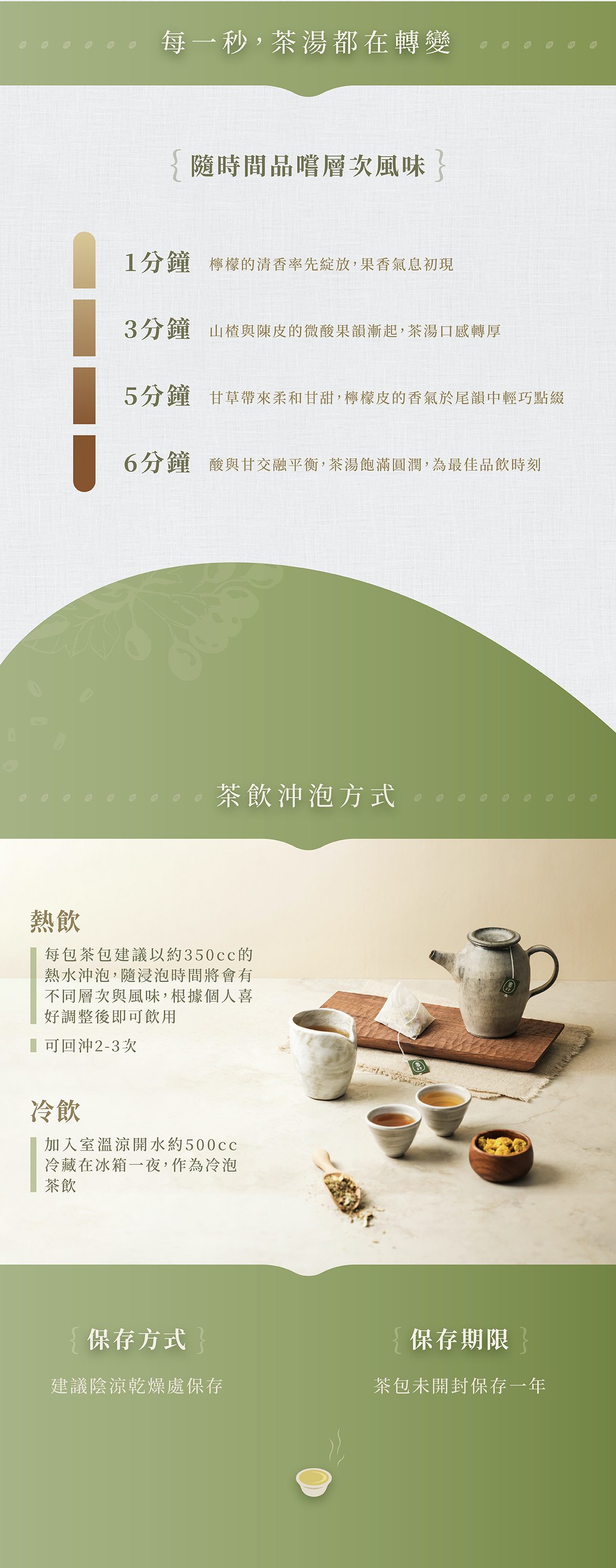 每包建議以熱水沖泡350cc,5分鐘後即可飲用。可回沖2-3次。