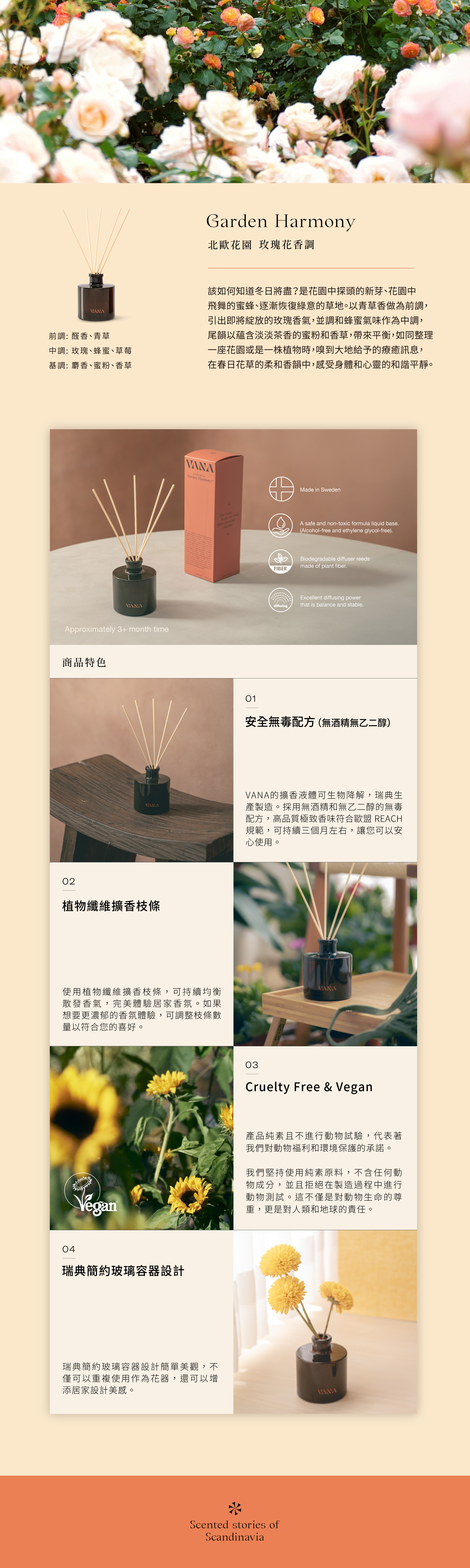 以青草香做為前調,引出即將綻放的玫瑰香氣,並調和蜂蜜氣味作為中調,尾韻以蘊含淡淡茶香的蜜粉和香草,帶來平衡,如同整理一座花園或是一株植物時,嗅到大地給予的療癒訊息,在春日花草的柔和香韻中,感受身體和心靈的和諧平靜。瑞典簡約設計增添居家設計美感,香味可持續三個月左右。