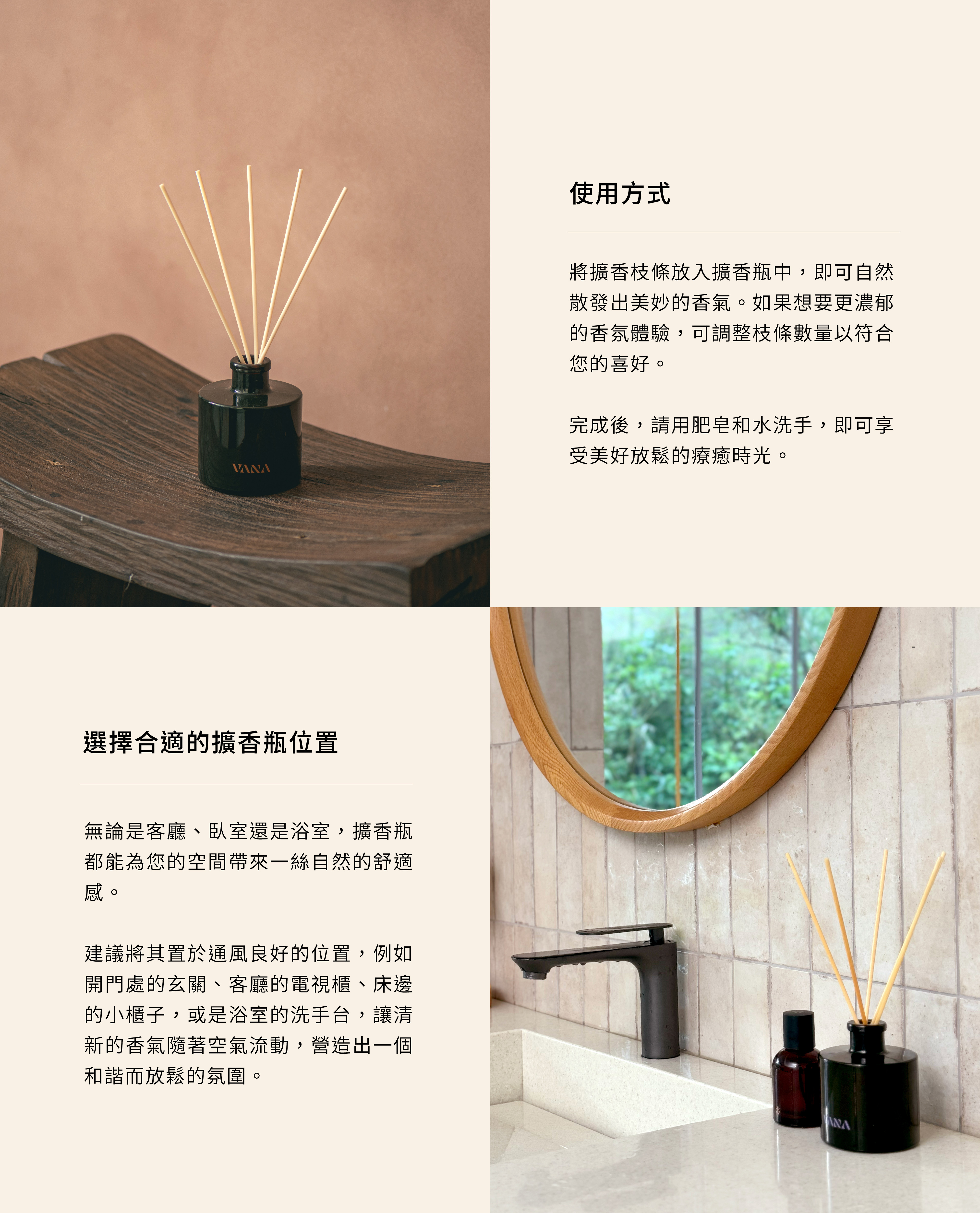 將擴香枝條放入擴香瓶中,即可自然散發出美妙的香氣。如果想要更濃郁的香氛體驗,可調整枝條數量以符合您的喜好。完成後,請用肥皂和水洗手,即可享受美好放鬆的療癒時光。