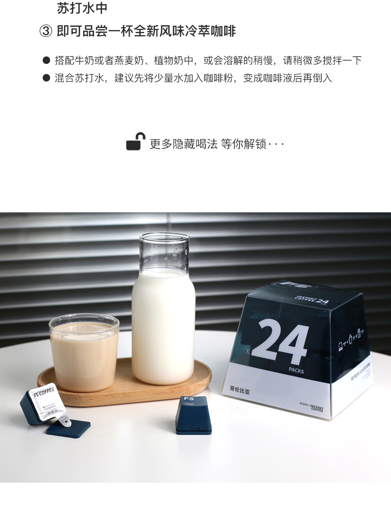 搭配牛奶或者燕麥奶、植物奶中,或會溶解的稍慢,請稍微多攪拌一下混合蘇打水,建議先將少量水加入咖啡粉,變成咖啡液後再倒入