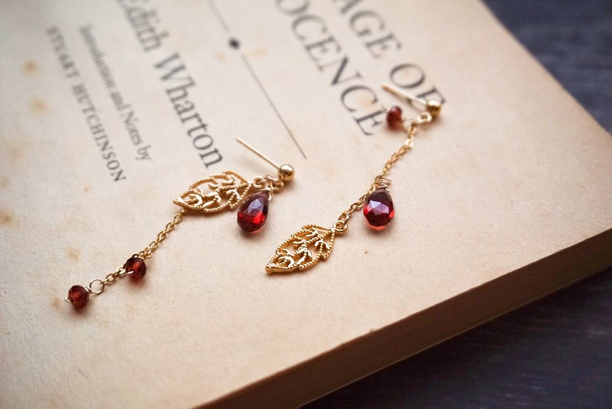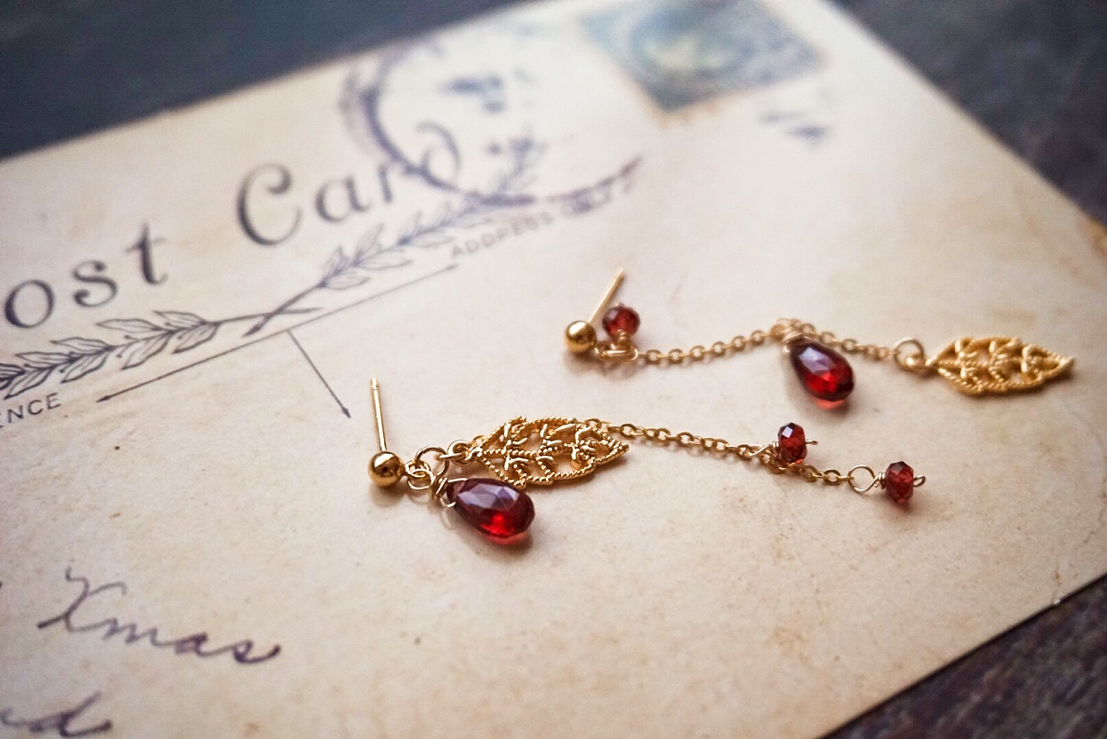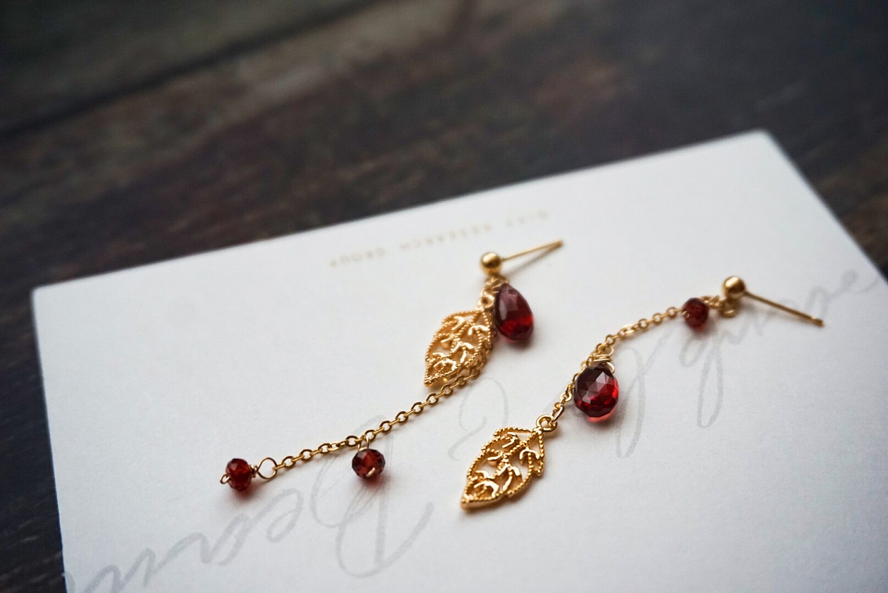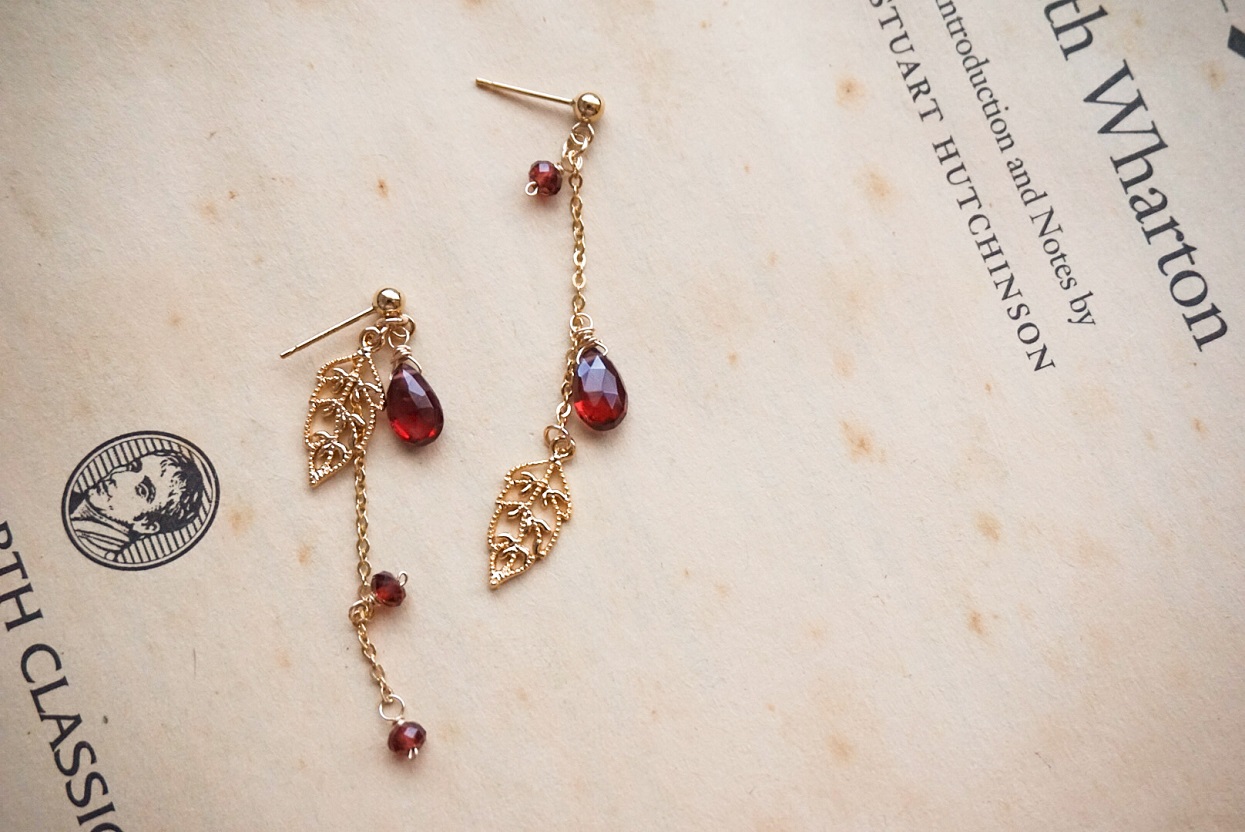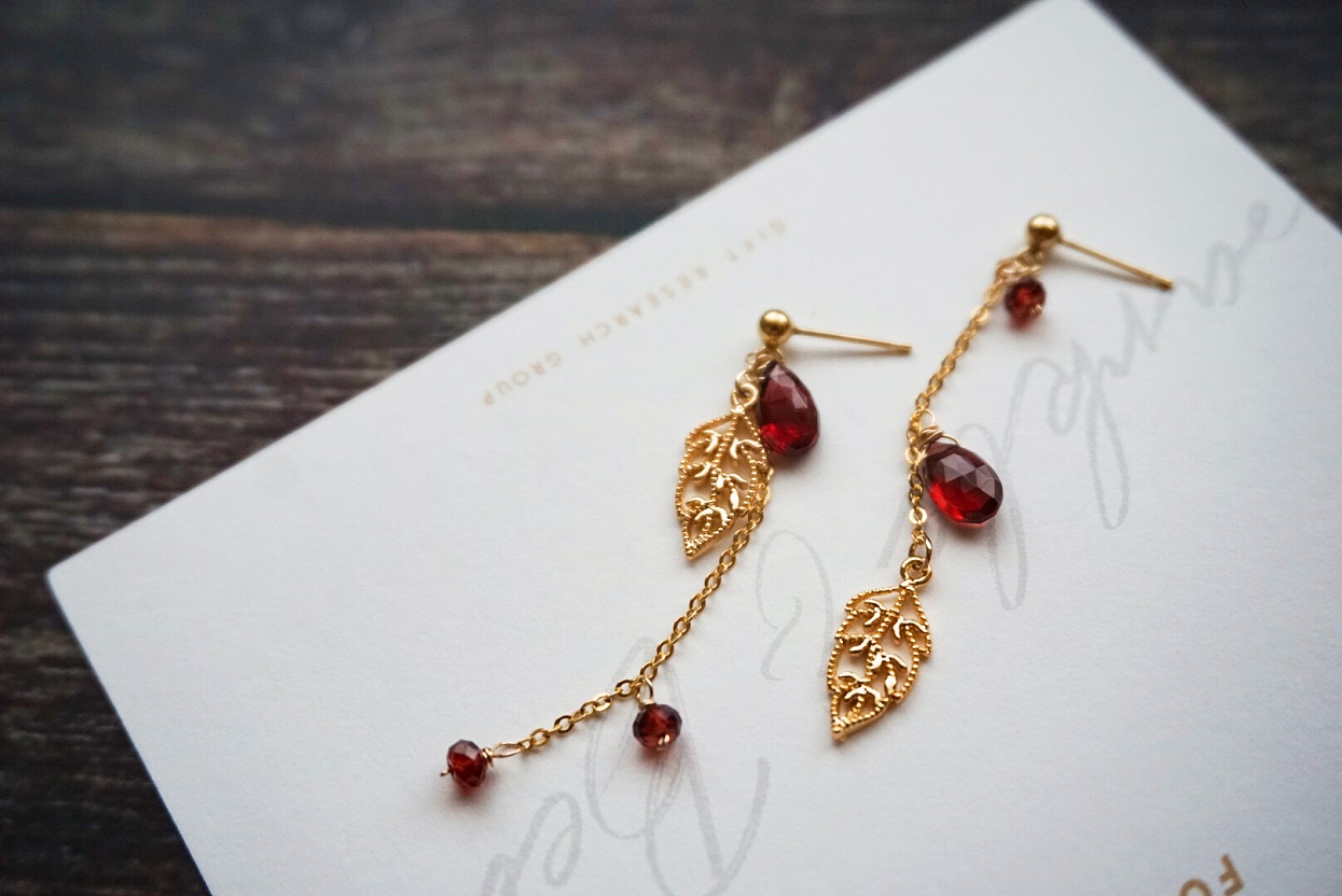 天然石榴石水晶鏤空樹葉日系Agete風格優雅耳環耳夾生日禮物