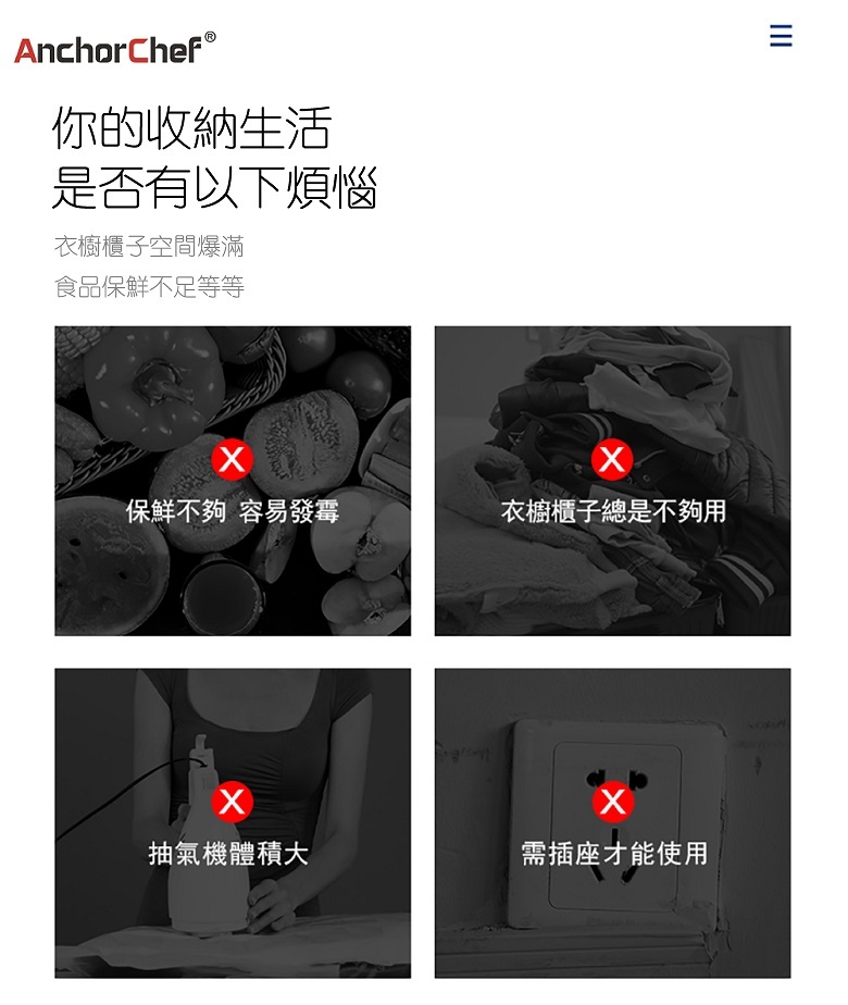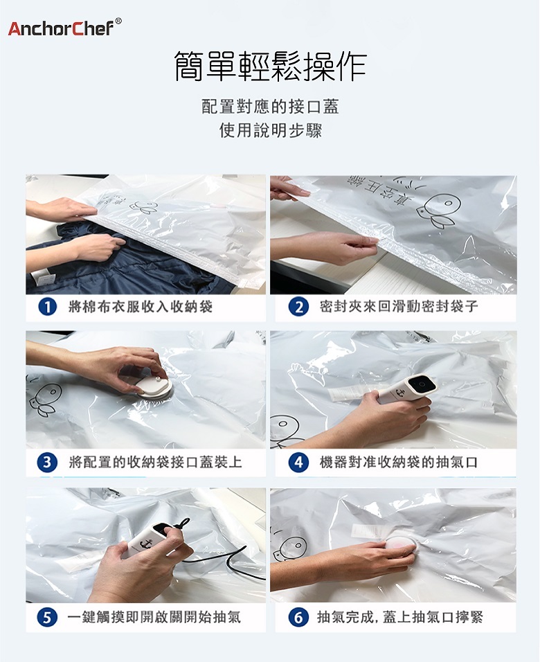 3.抽氣壓縮時間會隨著真空袋裡面衣物多寡,而有增減 (衣物越多所花時間越長)。