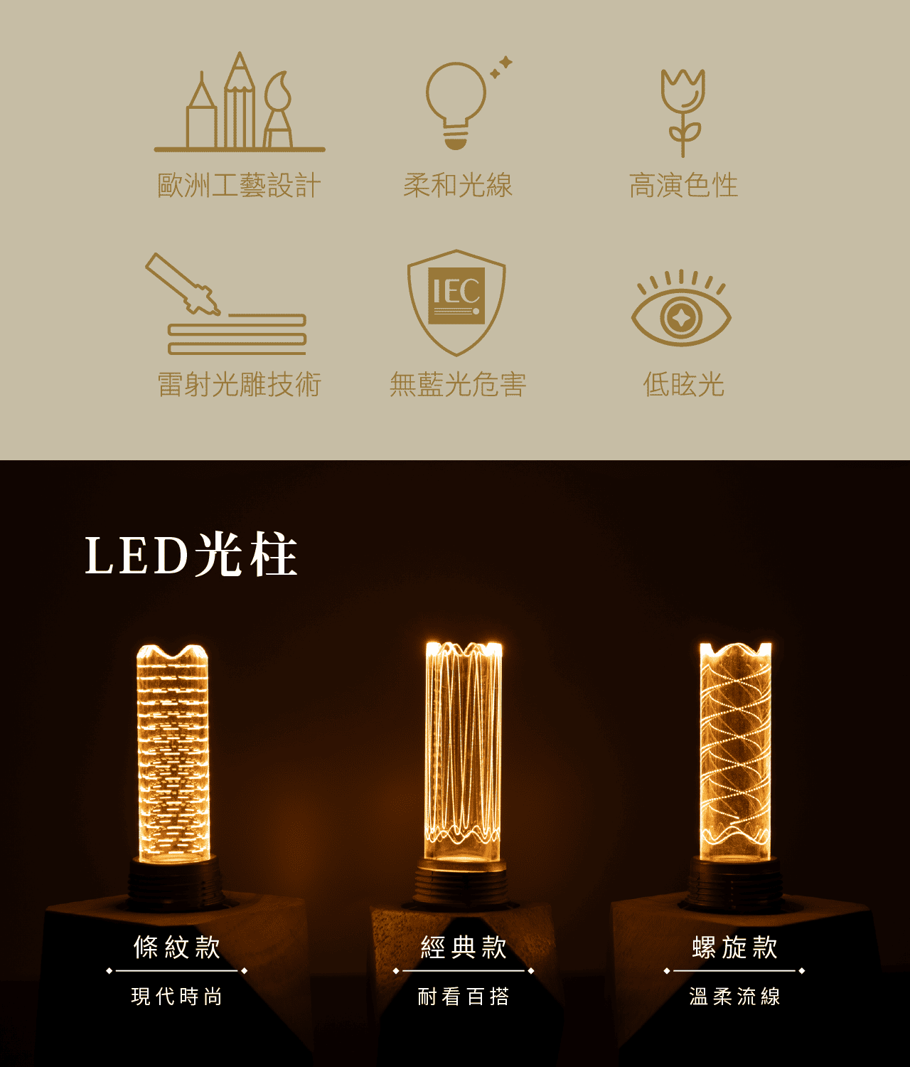 光柱的設計 - 經典款: 耐看百搭 / 螺旋款: 溫柔流線 / 條紋款: 現代時尚
