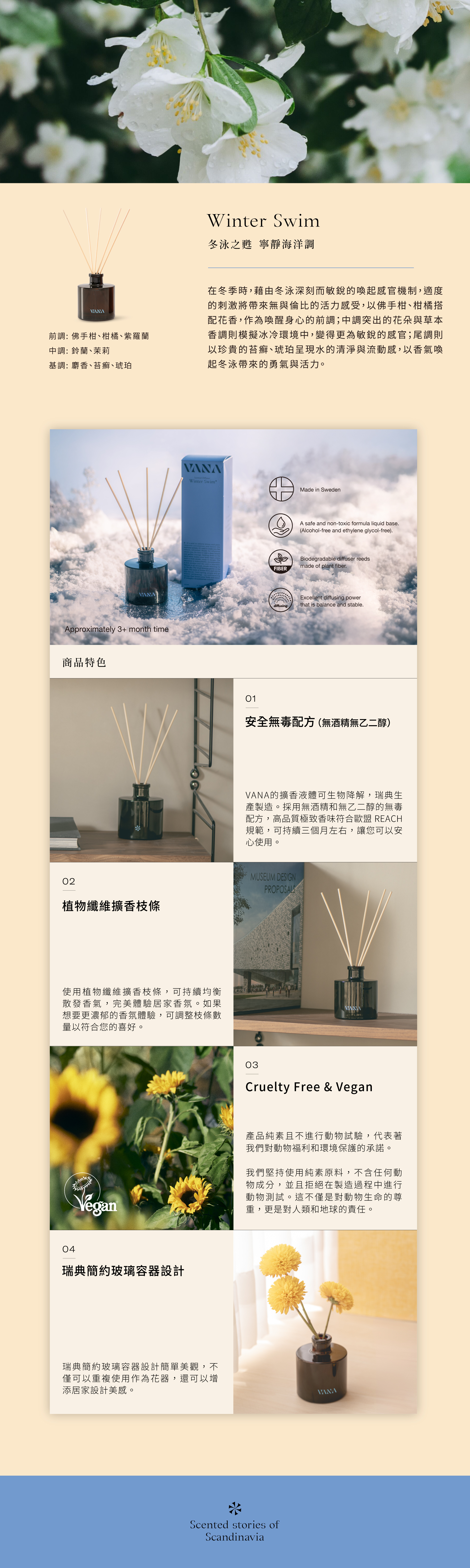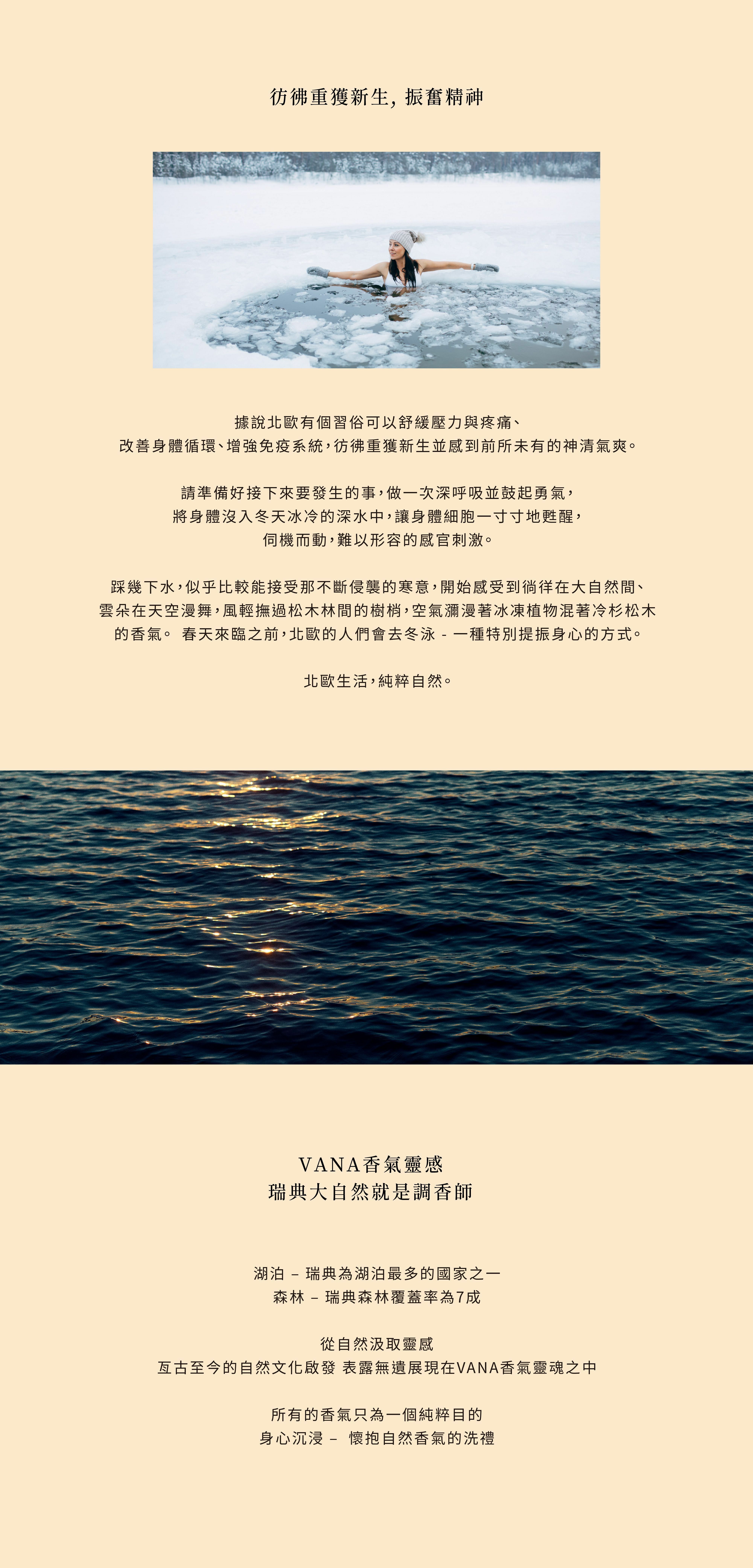 在冬季時,藉由冬泳深刻⽽敏銳的喚起感官機制,適度的刺激將帶來無與倫⽐的活⼒感受,以佛⼿柑、柑橘搭配花⾹,作為喚醒⾝⼼的前調;中調突出的花朵與草本⾹調則模擬冰冷環境中,變得更為敏銳的感;尾調則以珍貴的苔癬、琥珀呈現⽔的清淨與流動感,以⾹氣喚起冬泳帶來的勇氣與活⼒。